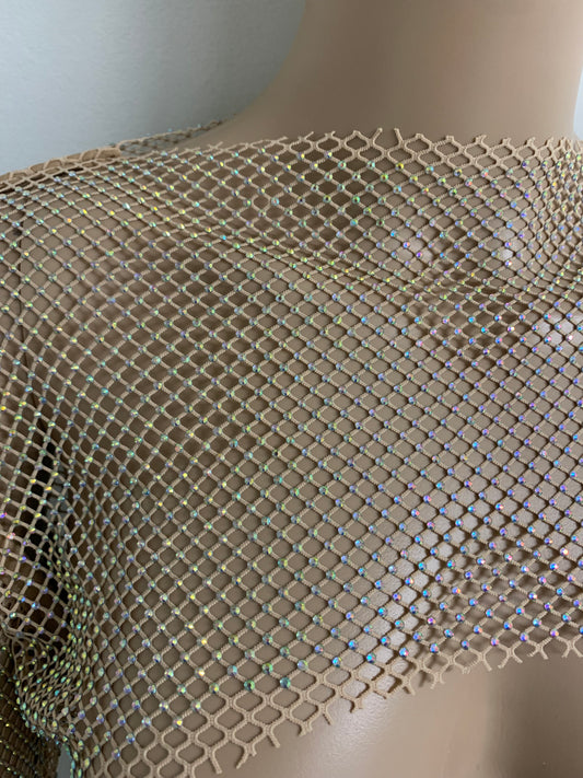Tan Crystal Long Sleeve Ultra Crop Top with Fluffy Trim