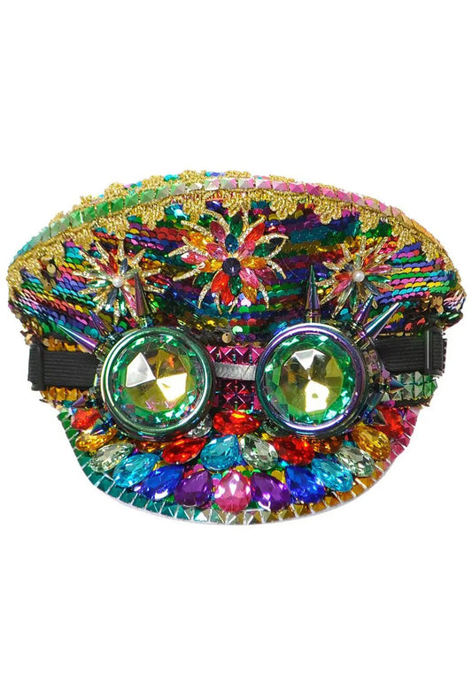 Gold Sequin Rhinestone Hat with Spiked Goggles
