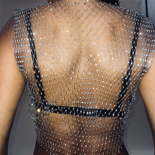 Silver Rhinestone Metal Mesh Diamond Cut Top