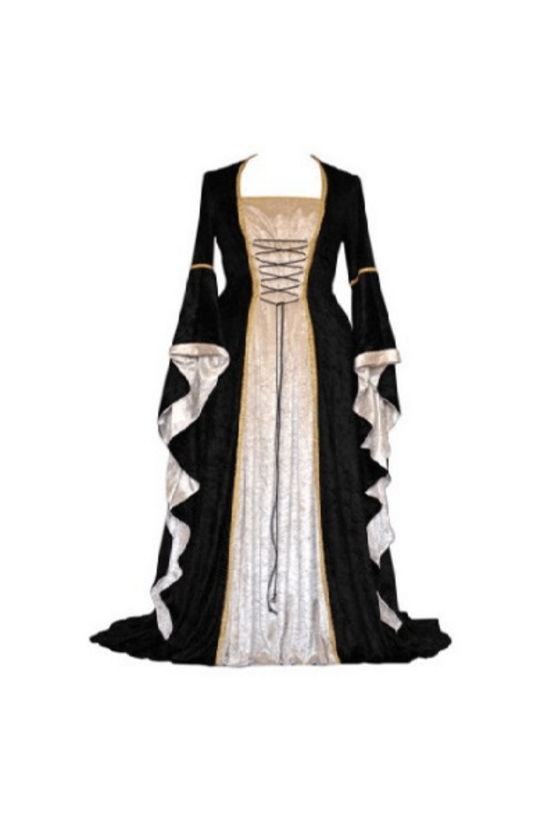 Get ready for the Renaissance Faire with our beautiful velvet bell sleeved gown. Featuring long gold trimmed sleeves and a tie front, this dress is perfect for your next medieval inspired costume. Dress features gold trim for that extra dimension.