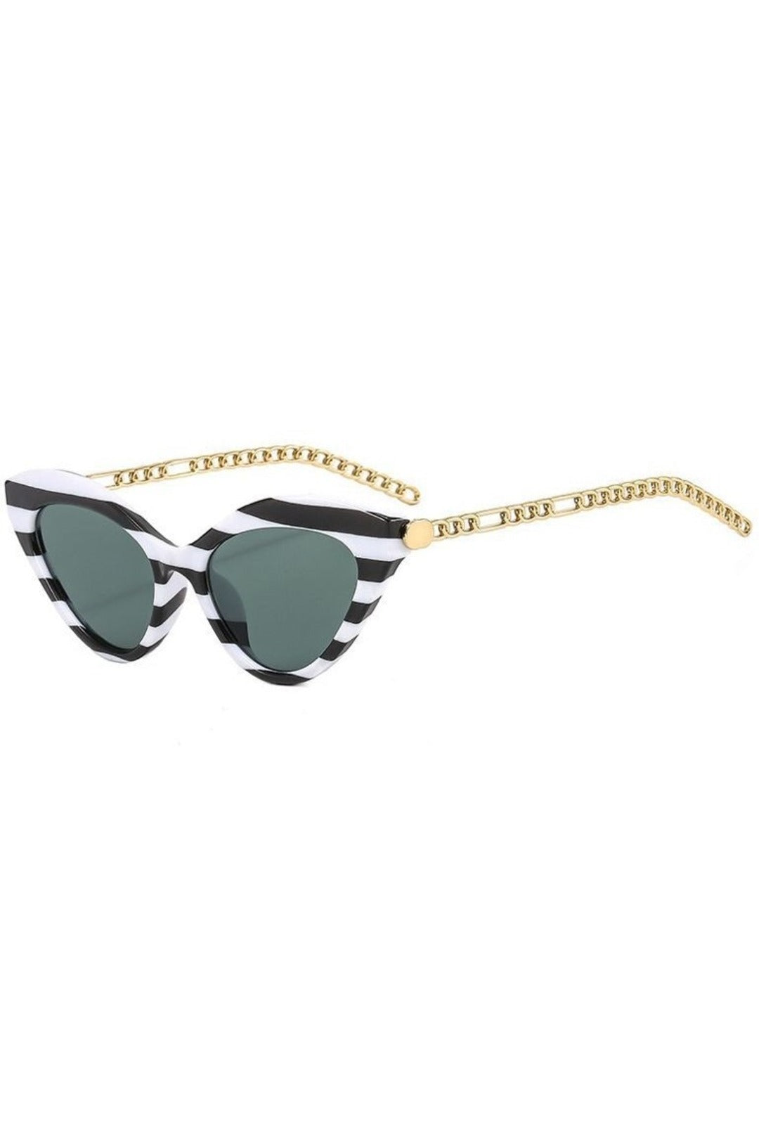 Take a stroll on the wild side with these Black and White Striped Cat Eye Glasses! Featuring a classic cat-eye frame in bold black and white stripes, plus gold chain style temples, you'll be lookin' sharp and stylin'!