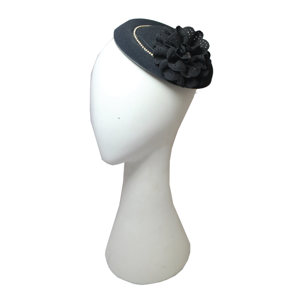 Stand out at your next event with this stunning fascinator. Complete with a black lace flower on top, this hat is ideal touch for any outfit!