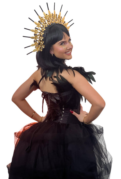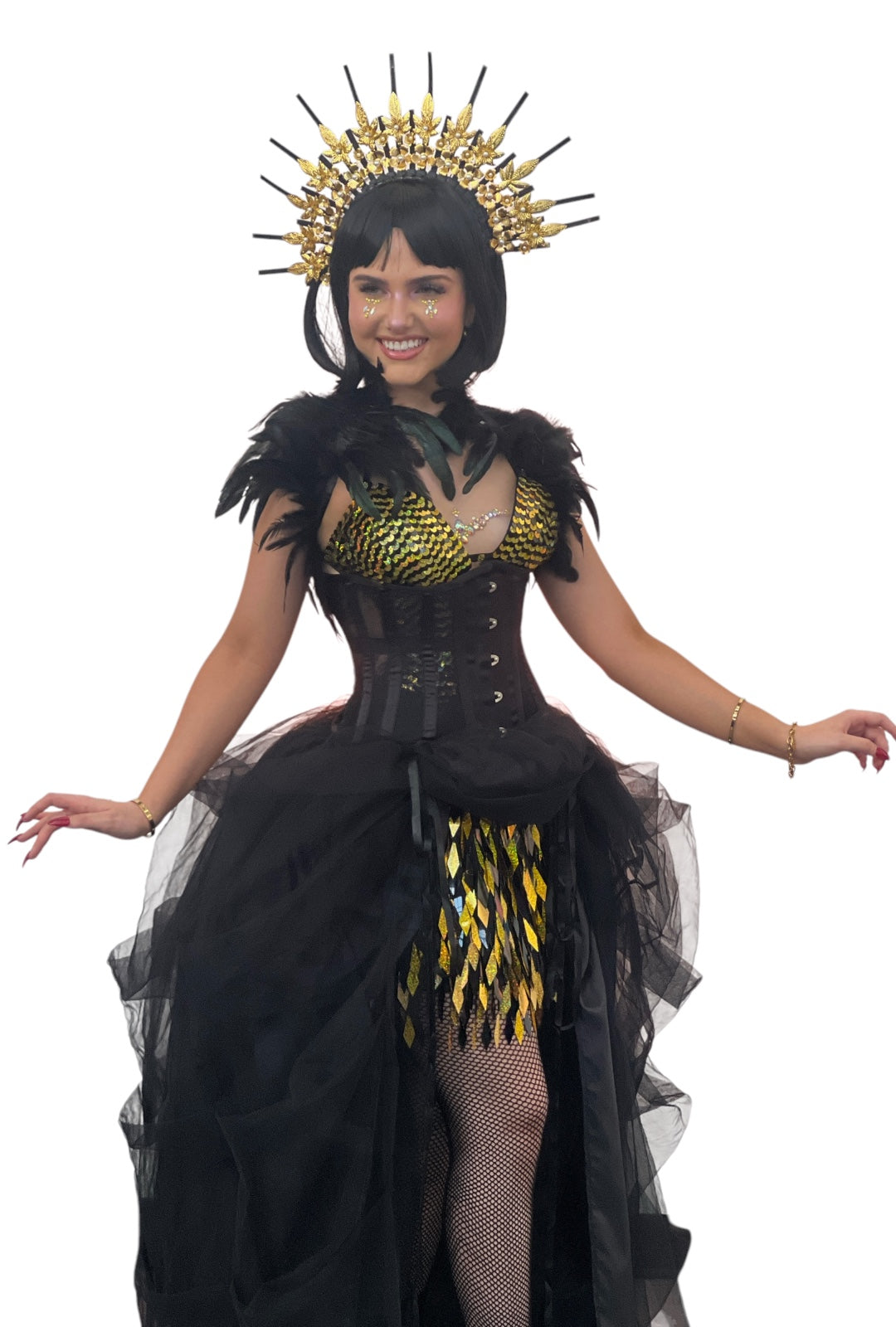 Shine bright in our Black & Gold Line Festival Dress. Featuring a fully sequinned bodice and a skirt with diamond sequins that move and sway as you dance. This black & gold dress is perfect for making a statement at festivals. The beading adds a touch of glamour to this playful and eye-catching piece. Stand out from the crowd and have a little fun in our dress. (Festival-goers, this one's for you!)