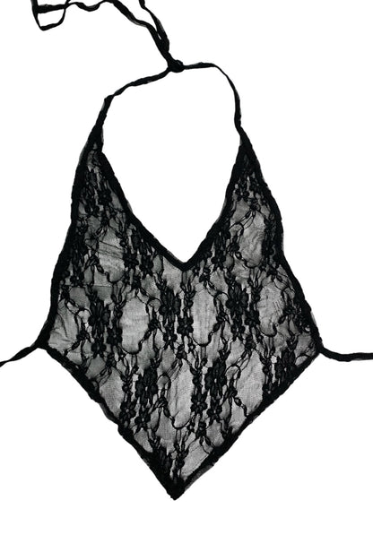 Show off your playful and stylish side with our Black Lace Diamond Cut Halter Neck Top! This unique top features a beautiful floral lace design, stretchy sheer fabric, and a daring backless design. Perfect for festivals and adding a touch of edge to any outfit.