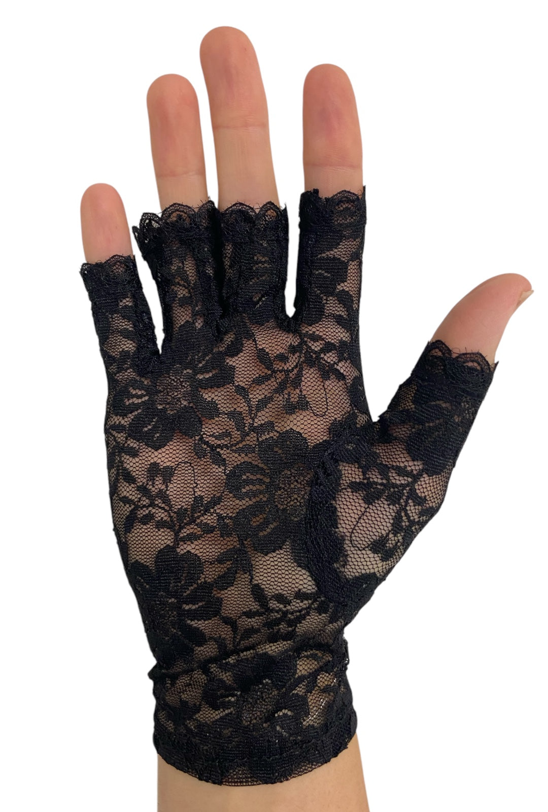 These black lace fingerless gloves are a perfect addition to your 1980's look. Patterned in a delicate black lace, these gloves are elasticated so that they will stay put on your hands, no matter how vigorously you dance.