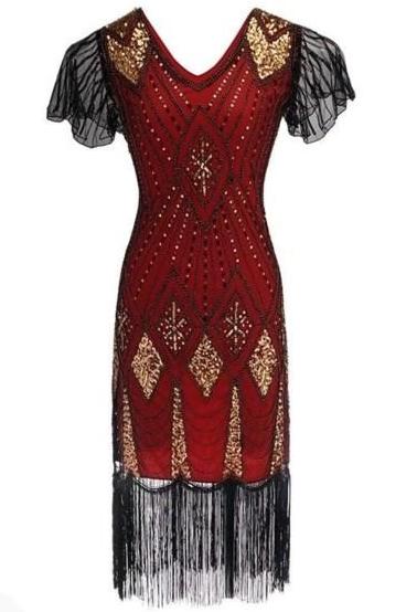 Beautiful deep red Gatsby styled dress with black mesh overlay, gold sequin and beading, black fringing at the bottom and black flutter sleeves.