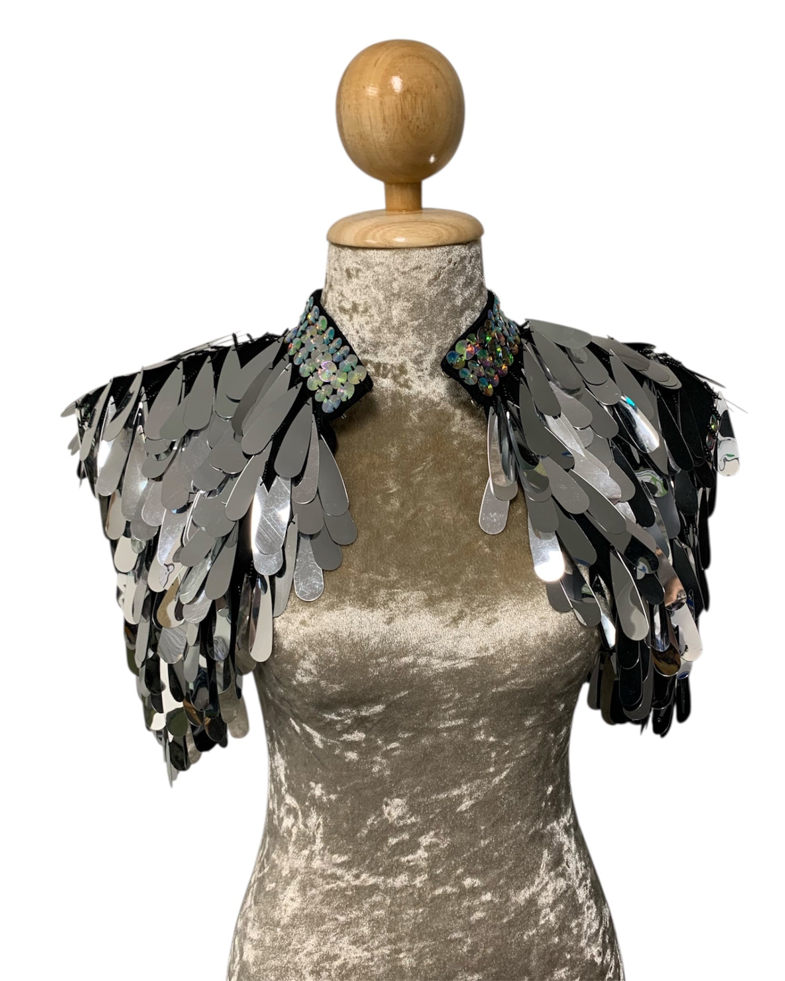 Shine bright at your next festival with our Black & Silver Festival Bolero! This sparkling black and silver jacket features a unique sequin and beaded design that moves, perfect for making a statement. Stay stylish and stand out with this festival must-have.