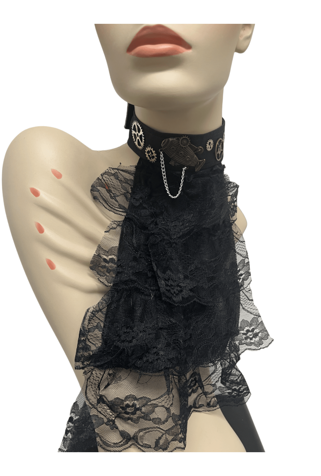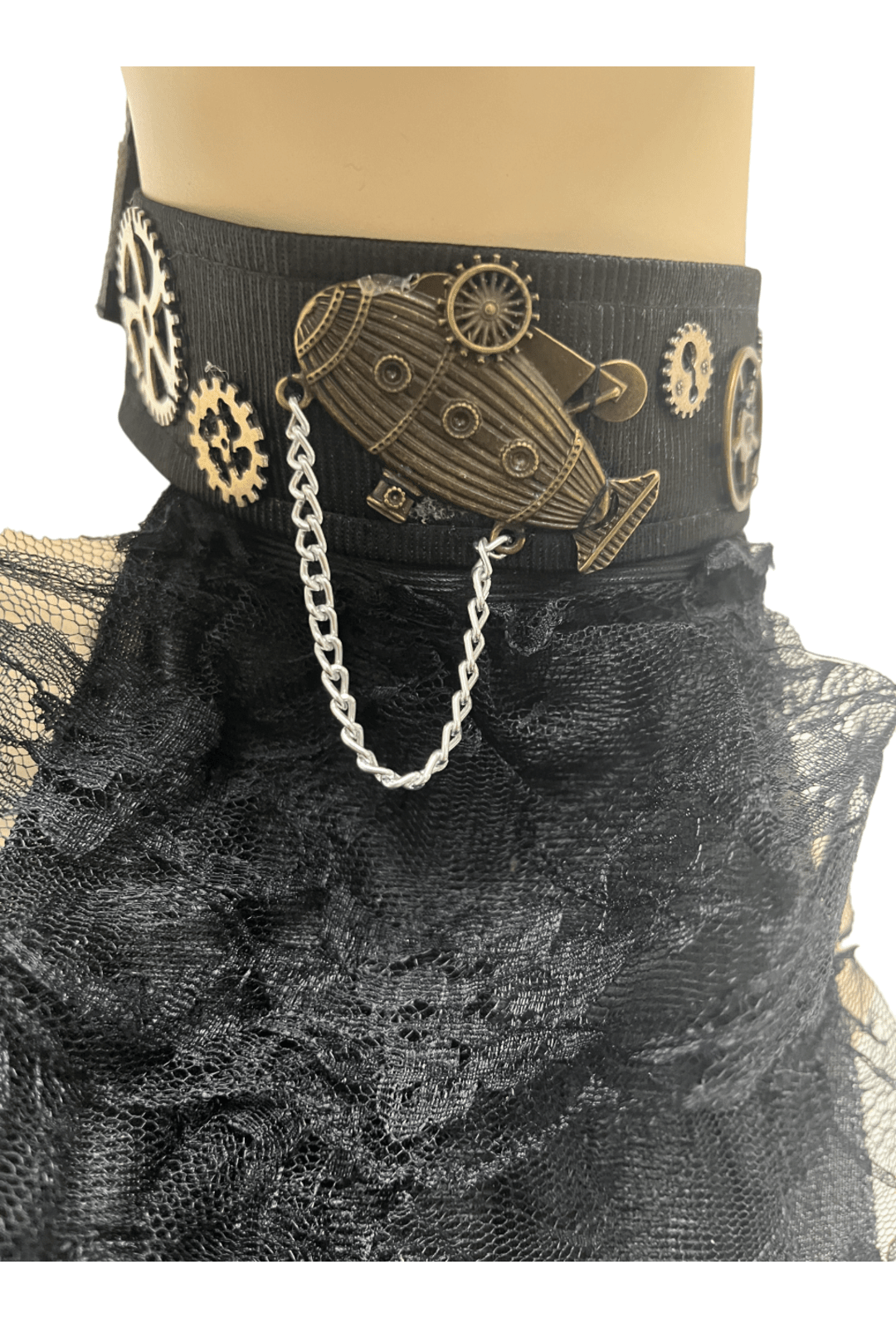This eye-catching steampunk black lace ruffled neck collar is the perfect addition to any steampunk outfit. Complete with silver embellishments with a silver chain, bronze zeppelin and gears, this pairs perfectly with any of our steampunk tops and corsets.