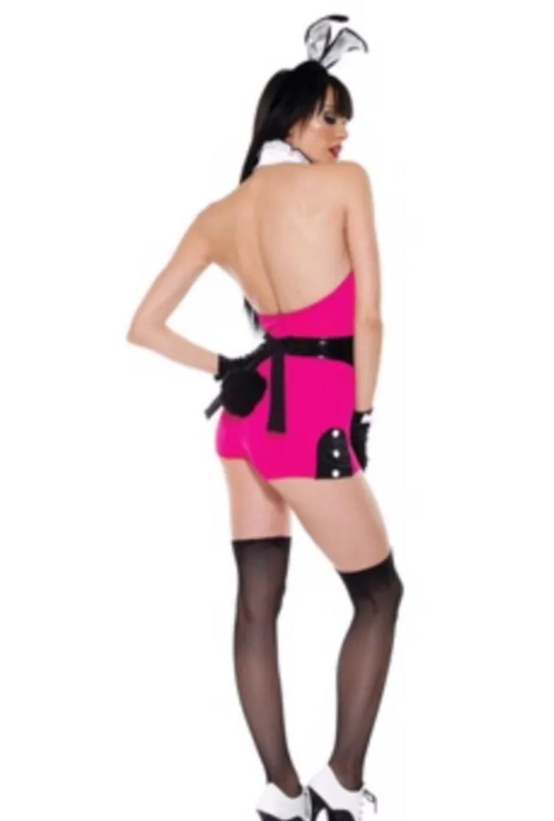 Be the bombshell bunny with this hot pink and black romper set! Show off your curves with the white lace accents and stylish black belt. The black rabbit ear headband and gloves add the perfect finishing touches to complete the ensemble! Dare to be bold and stand out!