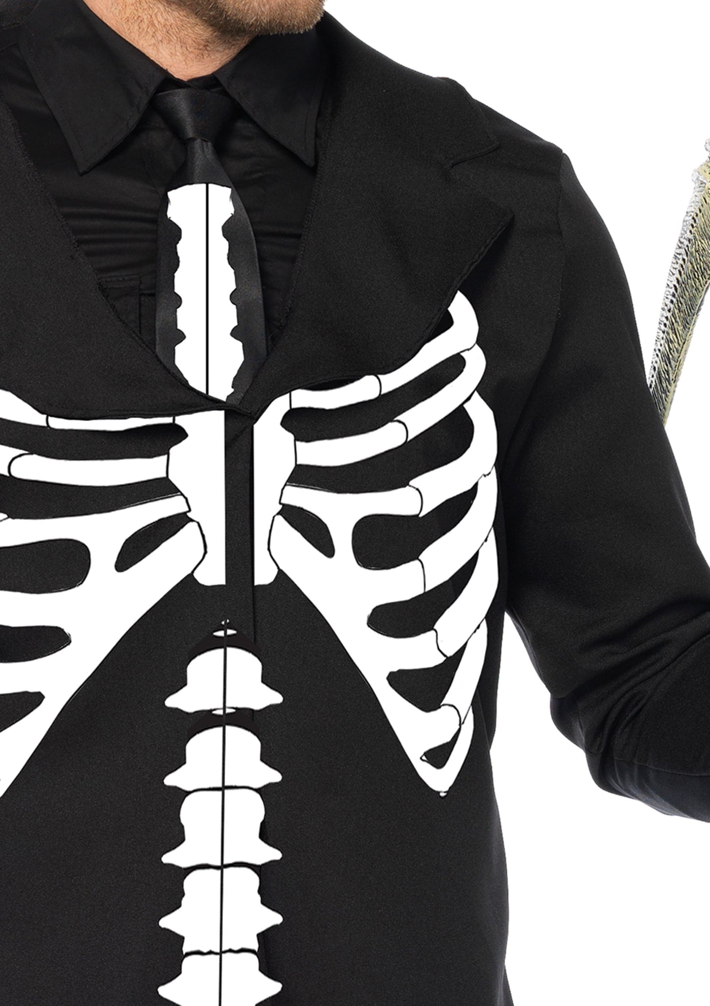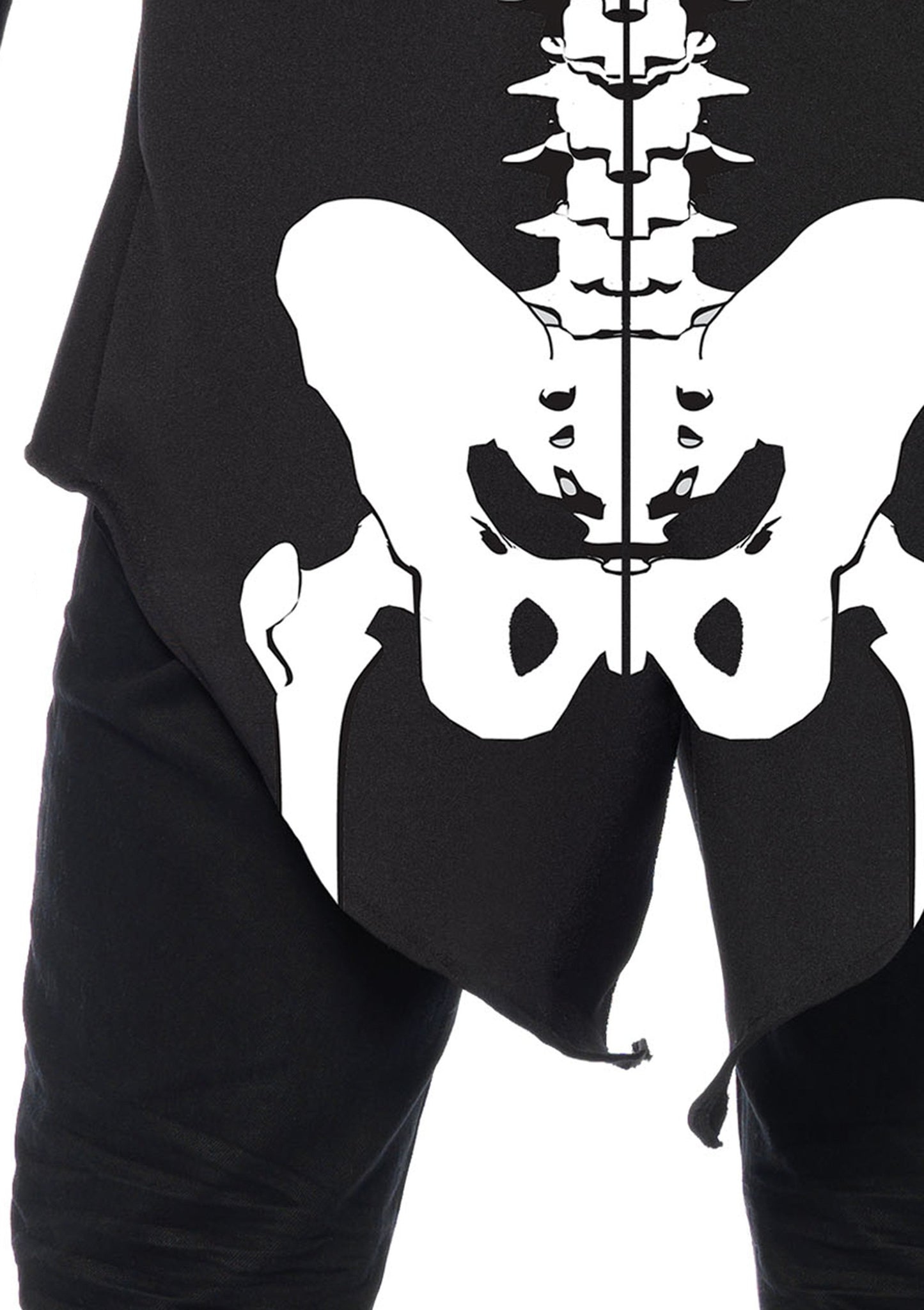 Includes long jacket with skeleton printing on the back and front and skeleton print neck tie.