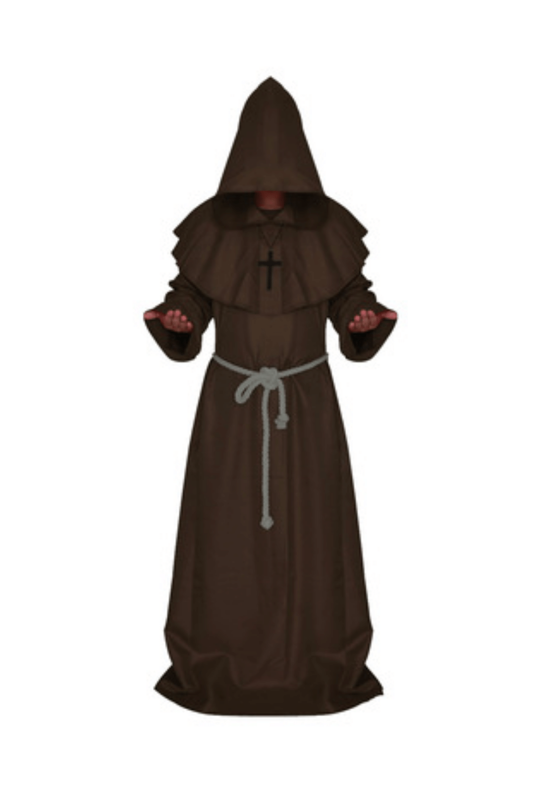 This costume includes a deluxe full length hooded heavy cotton brown robe with matching hooded cowl and white robe belt.