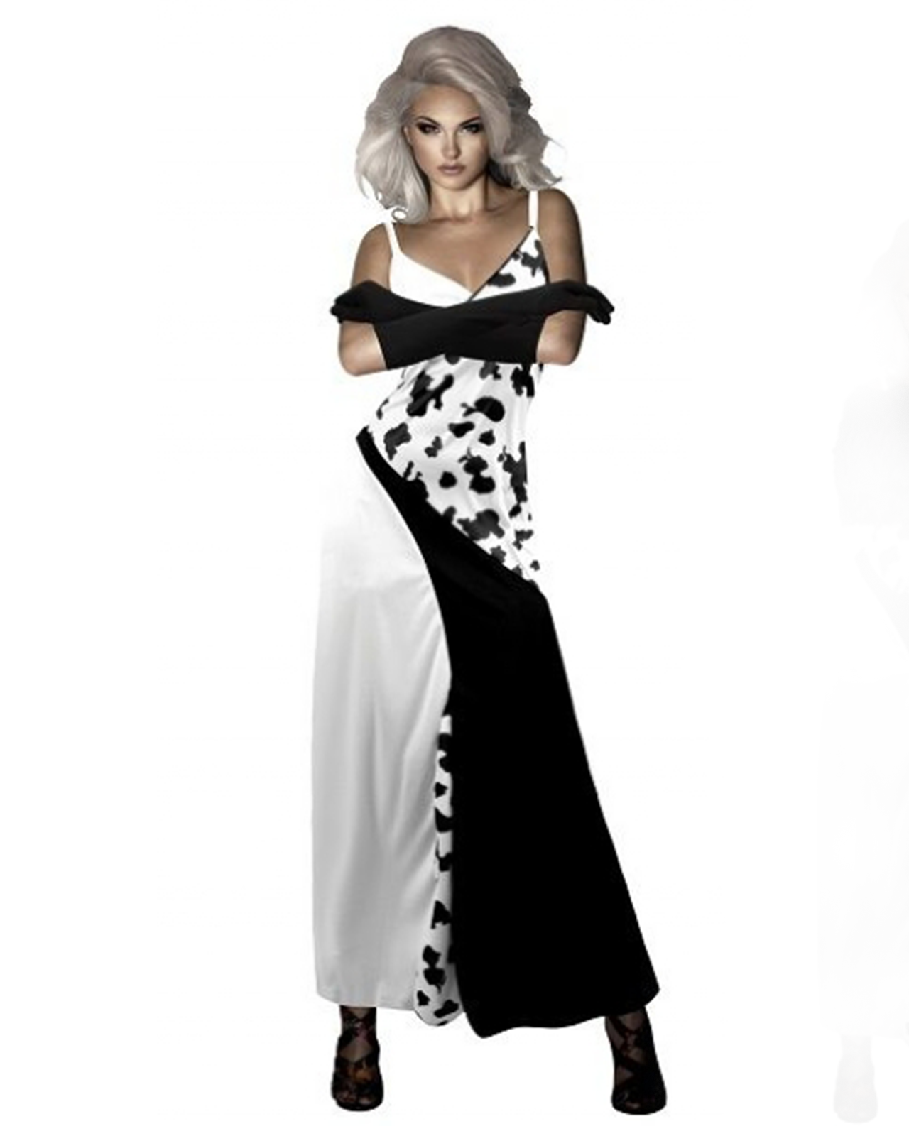 The Cruel Puppy Snatching Villain Costume includes a Black and White Split Dress with Dalmatian Print Patchwork, Black Gloves and a Black Fluffy Capelet.