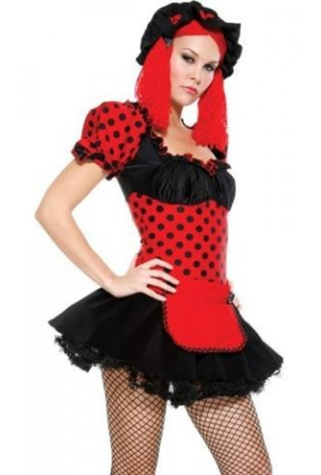 The Darque Doll looks like she's ready to create some mischief! She will turn heads with her vibrant, polka dot dress with delicate lace and a chic belt. Plus, an adorable wig, bonnet and apron to complete her look. Perfect for any cute doll, like Ragedy Ann, but darker.