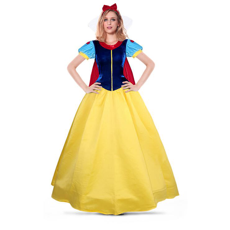 Deluxe Disney Snow White costume featuring floor length yellow skirt, blue velvet body and attached red velvet cape!