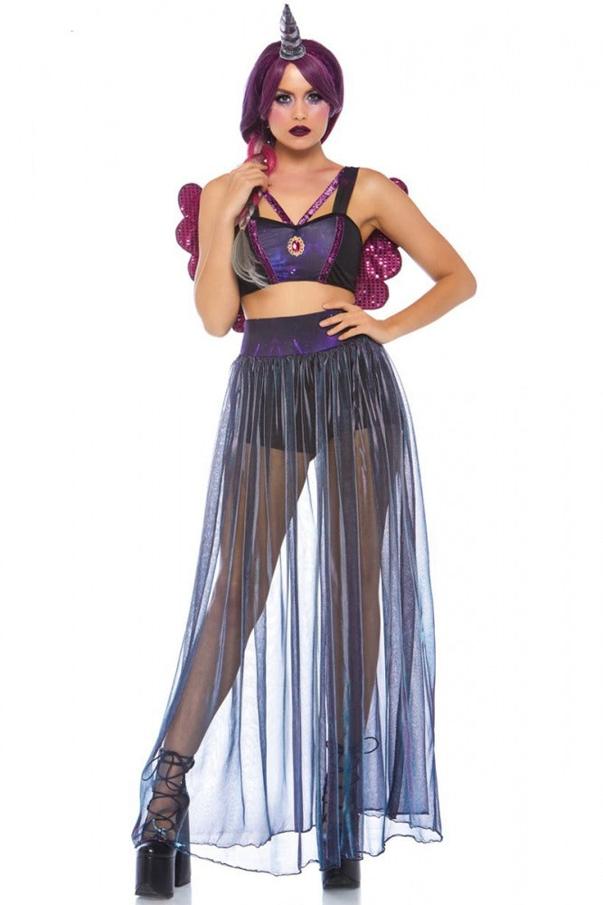 4 Piece Galaxy Unicorn Costume includes galaxy print crop top with detachable sequin wings, high waist shorts with iridescent skirt and attached sequin tail, and matching shimmer horn head Piece.