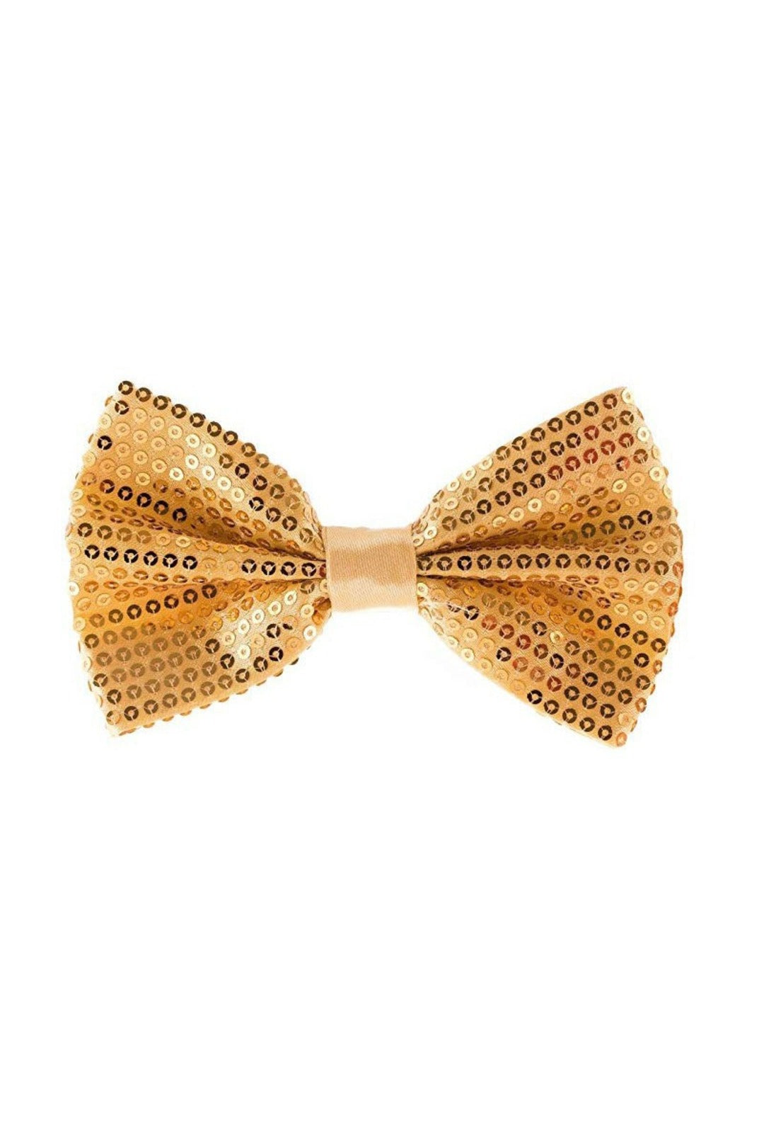 Pre-tied golden bow tie with gold sequins. Clip closure at back of the neck. Fully adjustable sizing.