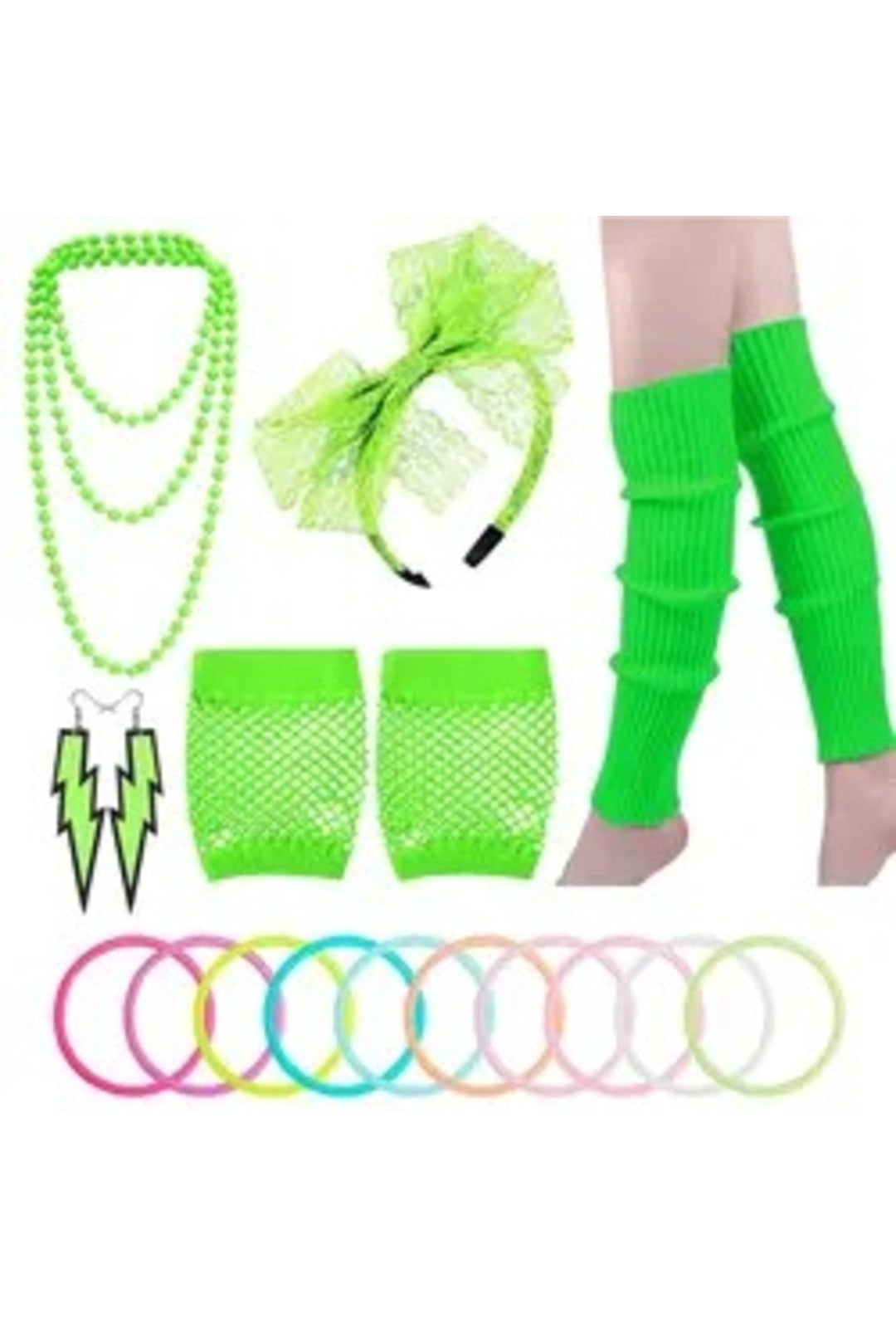 It's back to the 80's with this fantastic kit which includes a beaded necklace, electric lightning bolt earrings, legwarmers, plastic bangles, fishnet gloves and a cute headband with tulle bow.
