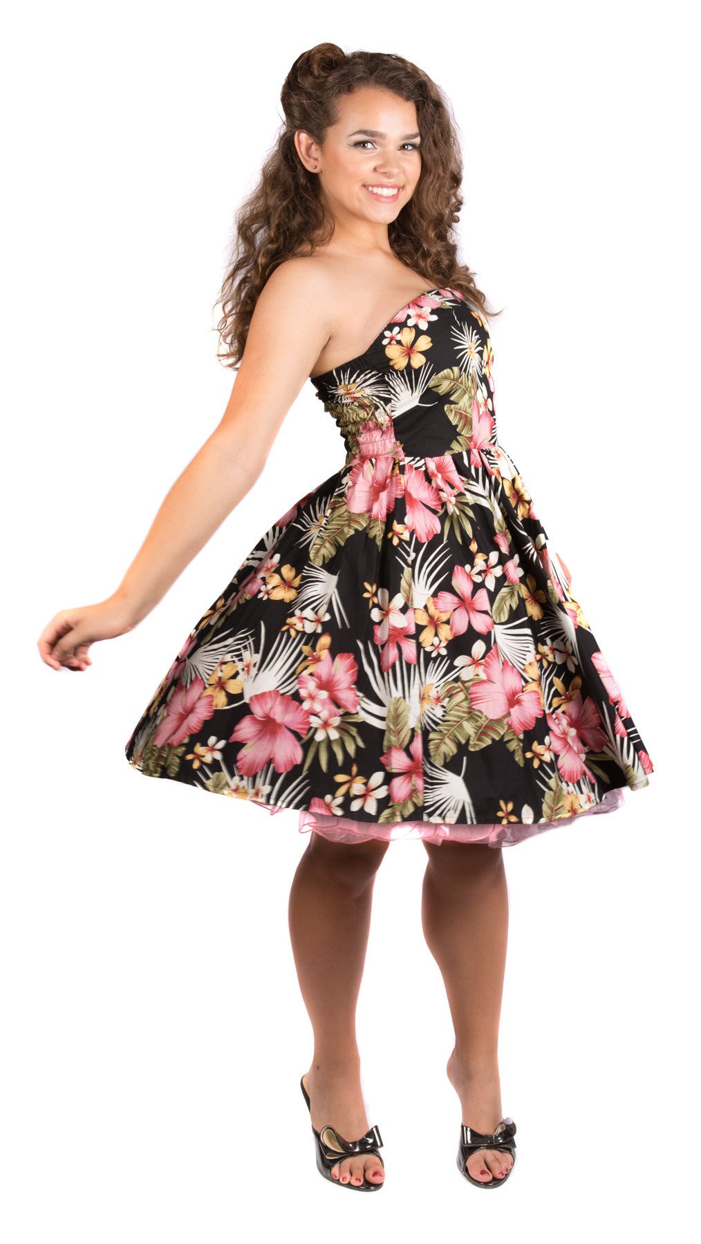 The elasticated back helps this gorgeous floral dress stay fitted and looking fabulous. Shown here with a pink petticoat underneath. Petticoats are sold separately. 100% Cotton