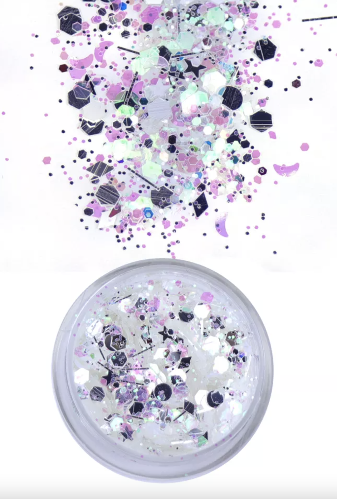 The iridescent white & purple glitter features various small silver, purple and iridescent white glitter. This glitter also glows in the dark under UV light. Great for festivals, parties and more!