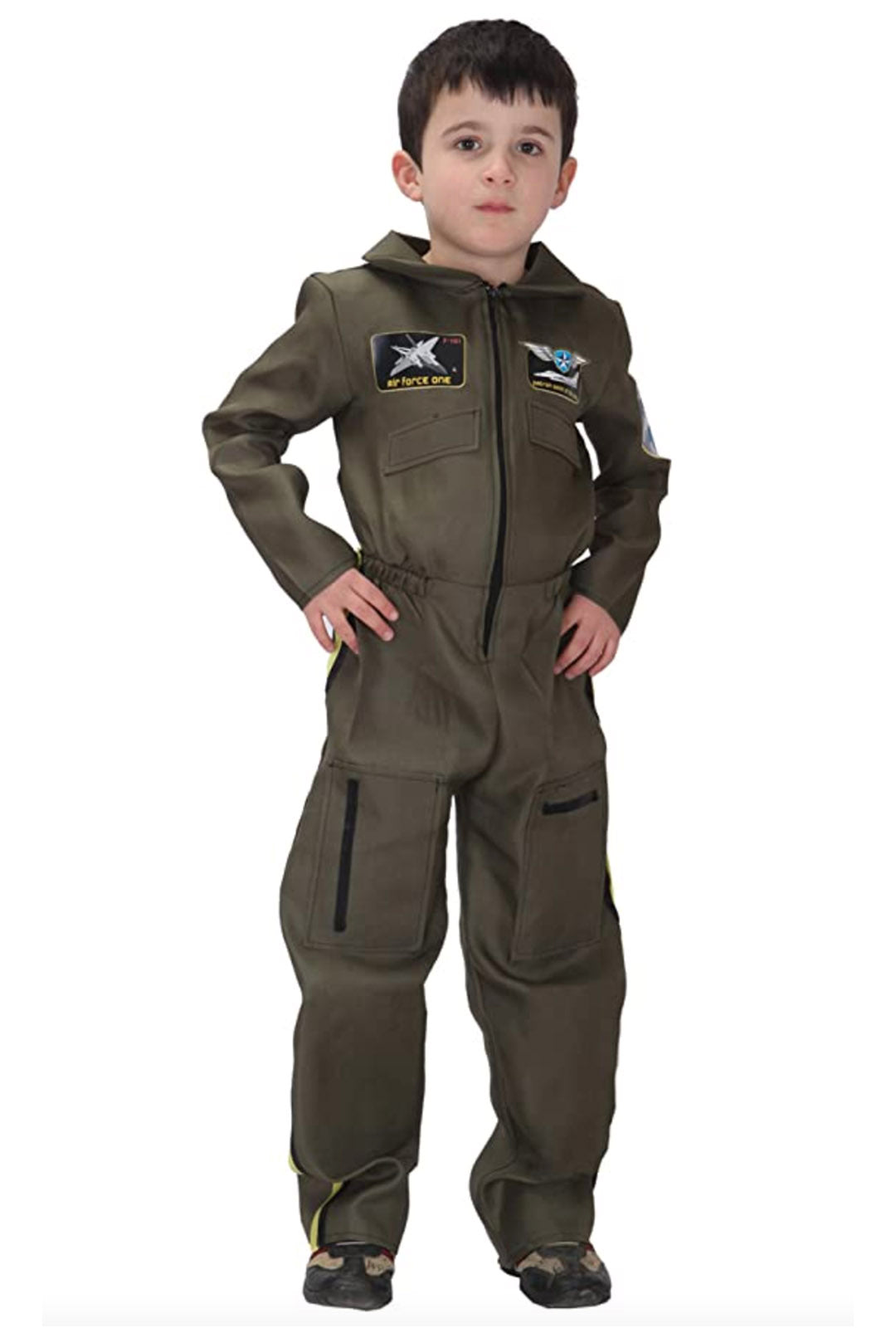 Costume includes a khaki green jumpsuit with air force patches on the chest and a zipper front closure.