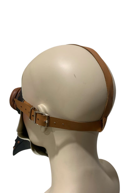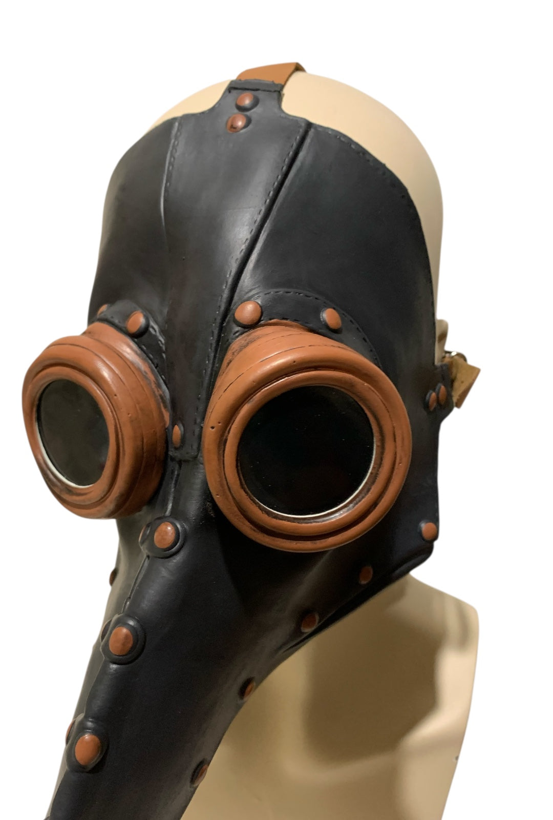 Black latex plague doctor mask with built in tinted goggles, brass-coloured stud details and adjustable straps.