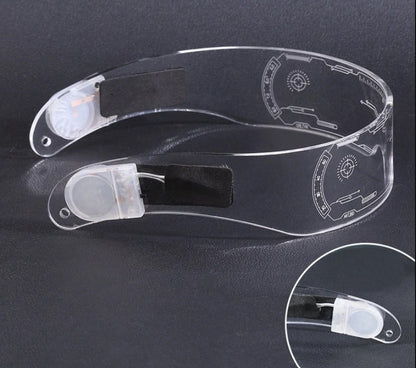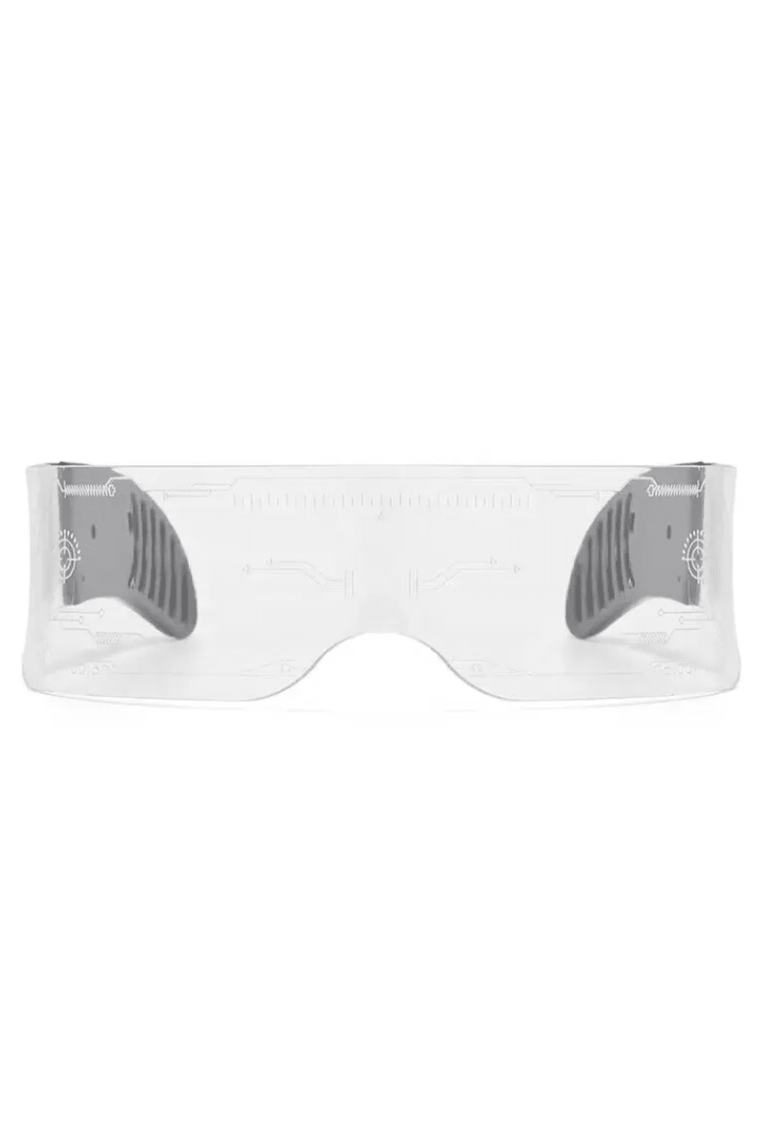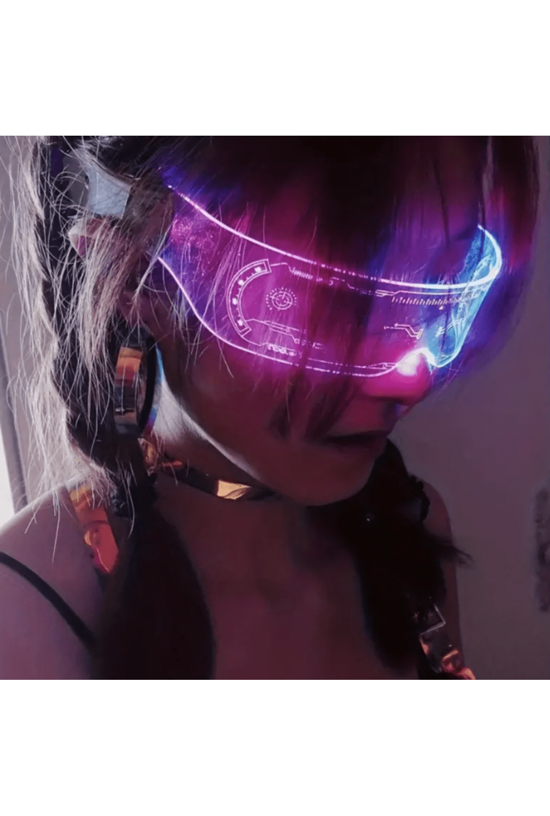 Our Cyberpunk Neon Glasses are so COOL! These Glasses are made out of a clear transparent material in a cyclops straight cut but shaped to fit the ears and nose, engraved cyber tech computer details all over the glasses. This style has 2 controls and allows a 2 tone colour across.