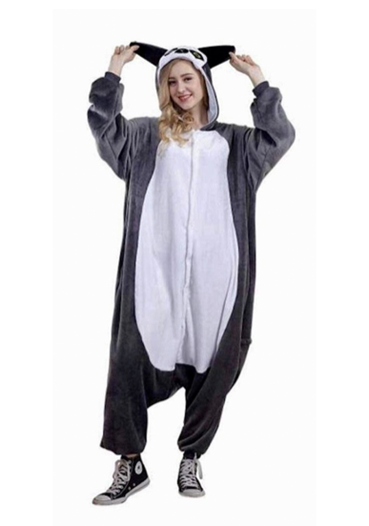 Stay warm this winter with this adorable Lemur onesie made with a super soft coral fleece. This onesie comes complete with a face detail on the hood and tail to complete the look.