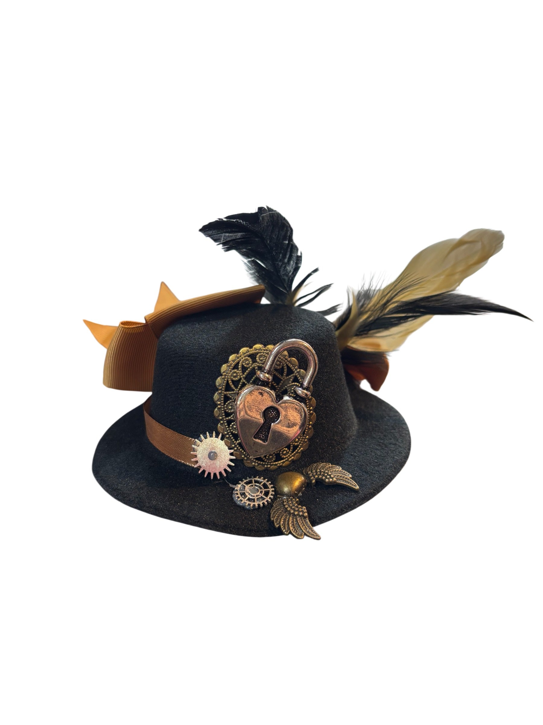 Elevate your style with this Mini Black Steampunk Hat, featuring a charming heart locket and a delicate bow. Perfect for adding a unique vintage flair to any outfit, this accessory blends classic steampunk elements with a touch of romance. Lightweight and eye-catching, it’s ideal for special occasions or everyday wear when you want to stand out with subtle elegance.