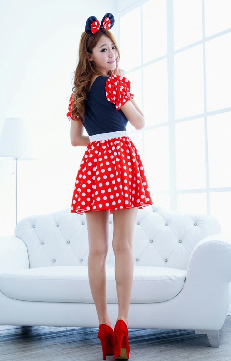 Including a cute ear headband with polka dot bow, this black and red polkadot dress is the perfect casual Minnie Mouse costume! available in size M/L.