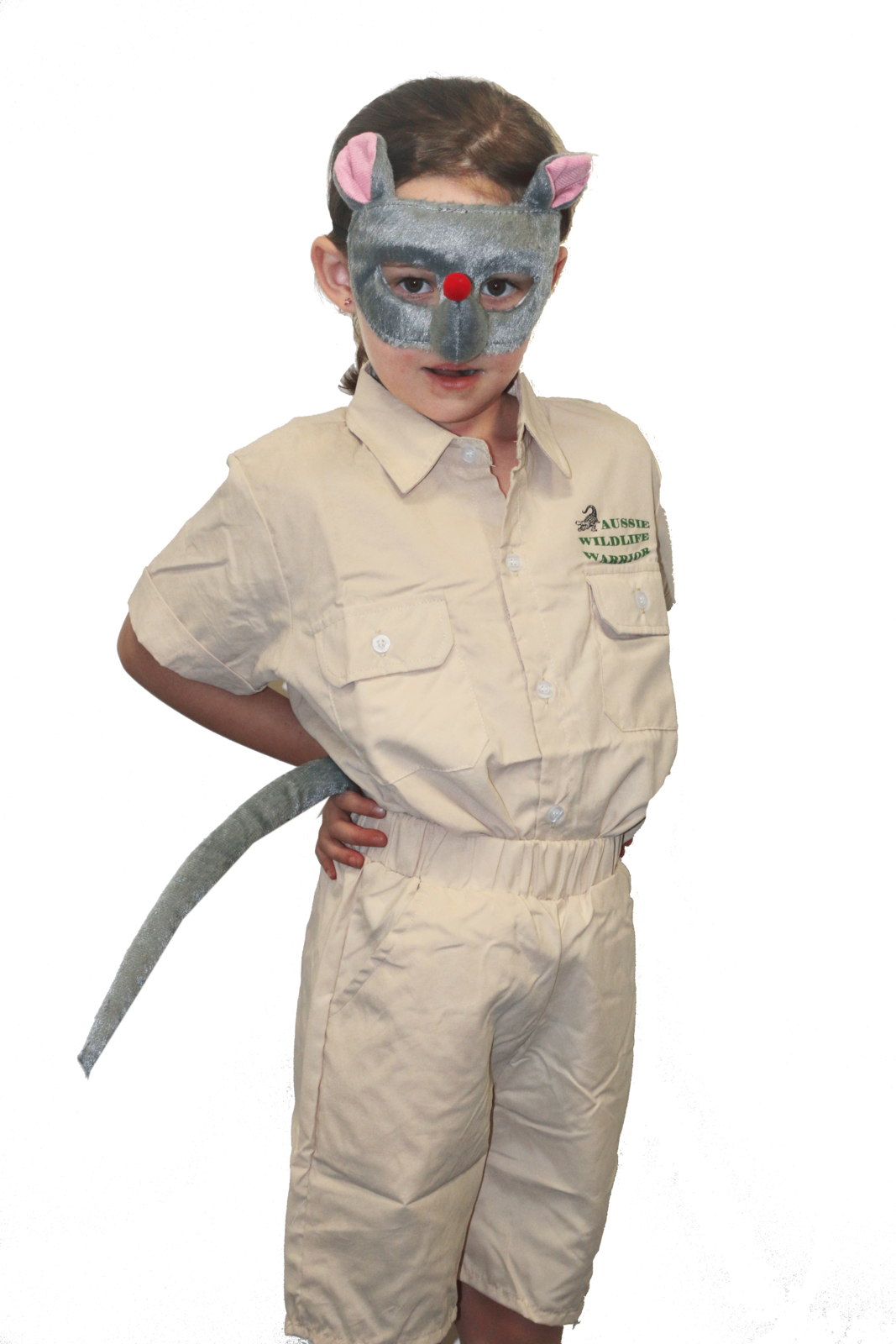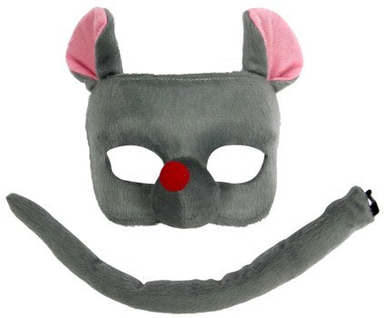Grey mouse eye mask with pink ears and red nose. Elastic strap at the back and includes matching tail.