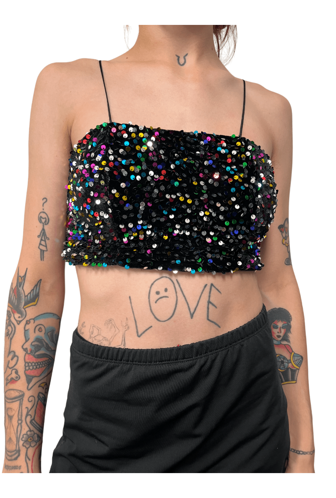 Get ready to shine at your next festival with our Multicolour Sequin Tube Crop! This playful top features a zip back and spaghetti straps for a secure fit, while the black velvet and sequins add a touch of glamour. Material has slight stretch and features cups