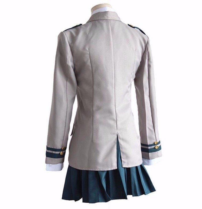 This Adults My Hero Academia costume includes satin lined jacket with gold buttons and green trim, forest green pleated skirt with elastic waist and red neck tie. Pair it with our Tsuyu Asui or Uraraka Ochako wigs to complete the look.