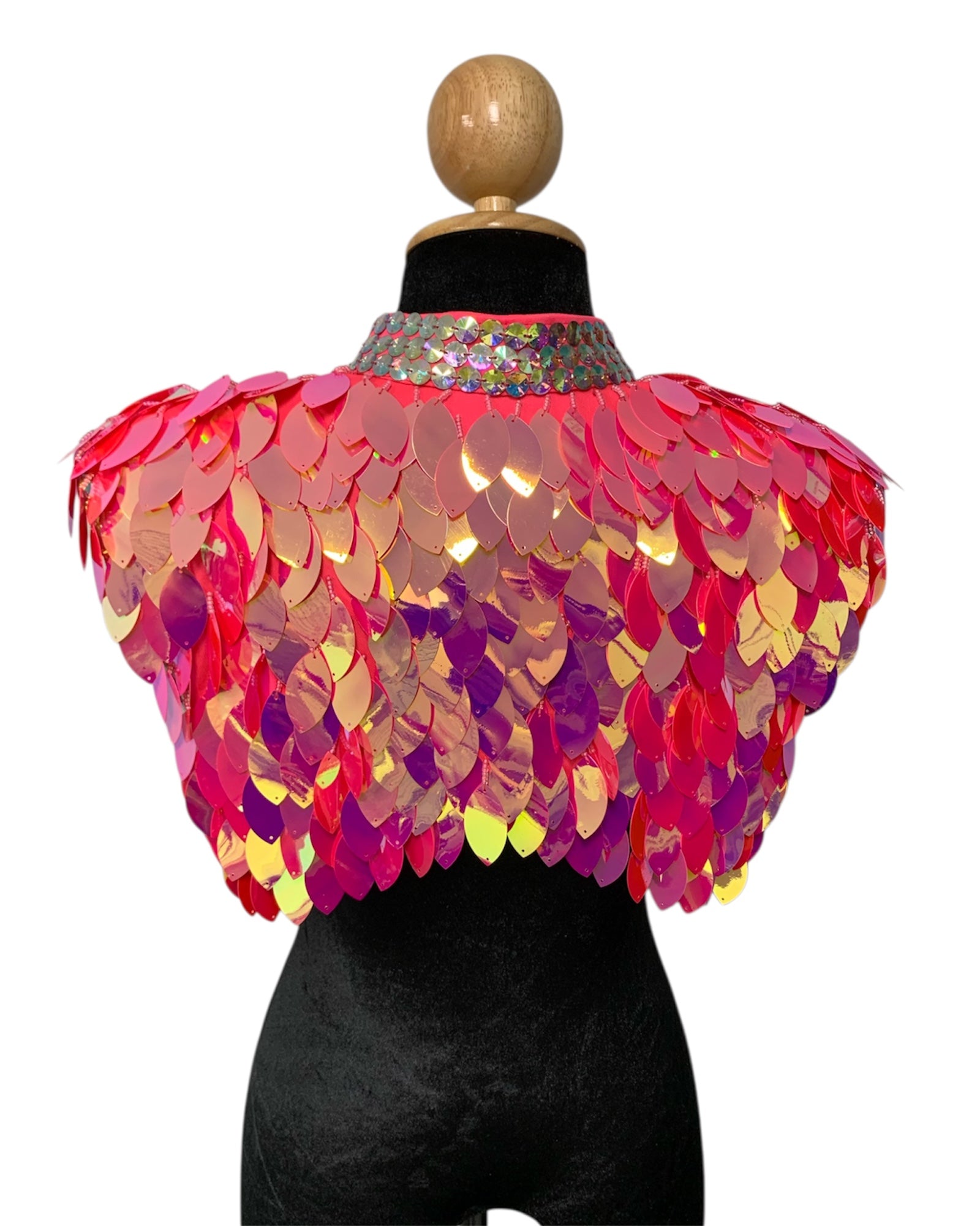 Shine bright at your next festival with our Neon Pink Festival Bolero! This sparkle neon pink jacket features a unique sequin and beaded design that moves, perfect for making a statement. Stay stylish and stand out with this festival must-have.