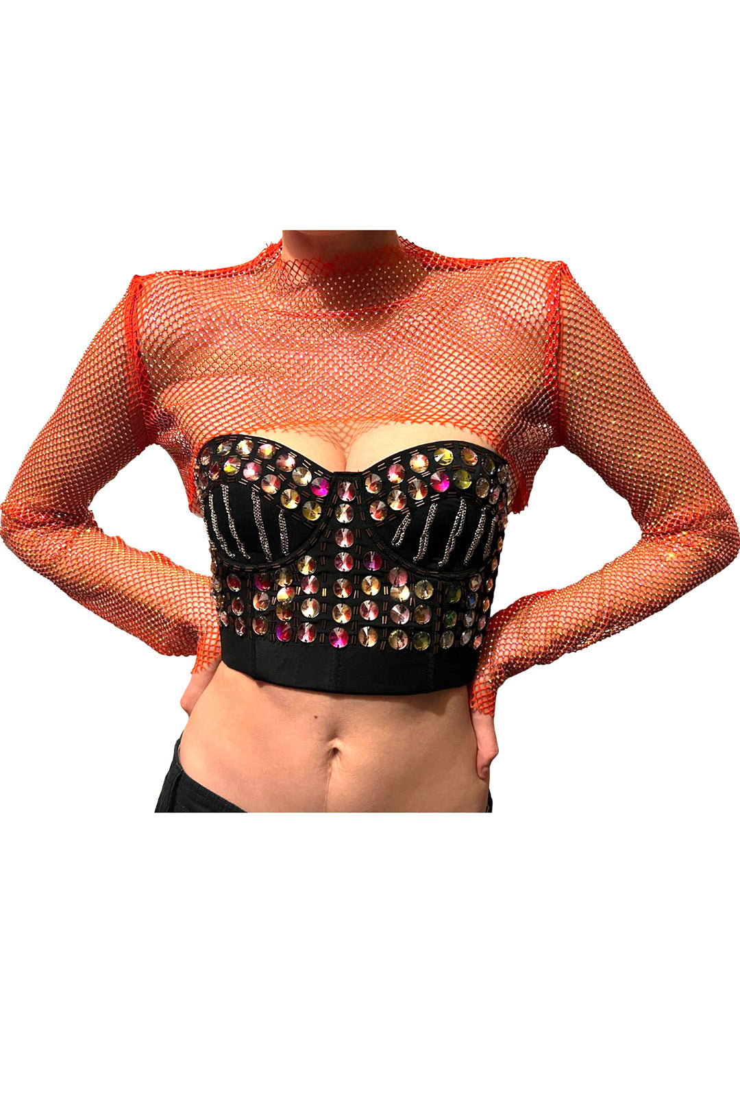 Make a trendy statement with this show-stopping Orange Crystal Ultra-Cropped Shrug Top, a fiercely fashionable piece that'll have all eyes on you! Crafted from stretchy fishnet material and embellished with sparkling rhinestones, this super-cute top is sure to take your style to glam heights! Available in AU 6-12. Who's ready to rock it?!