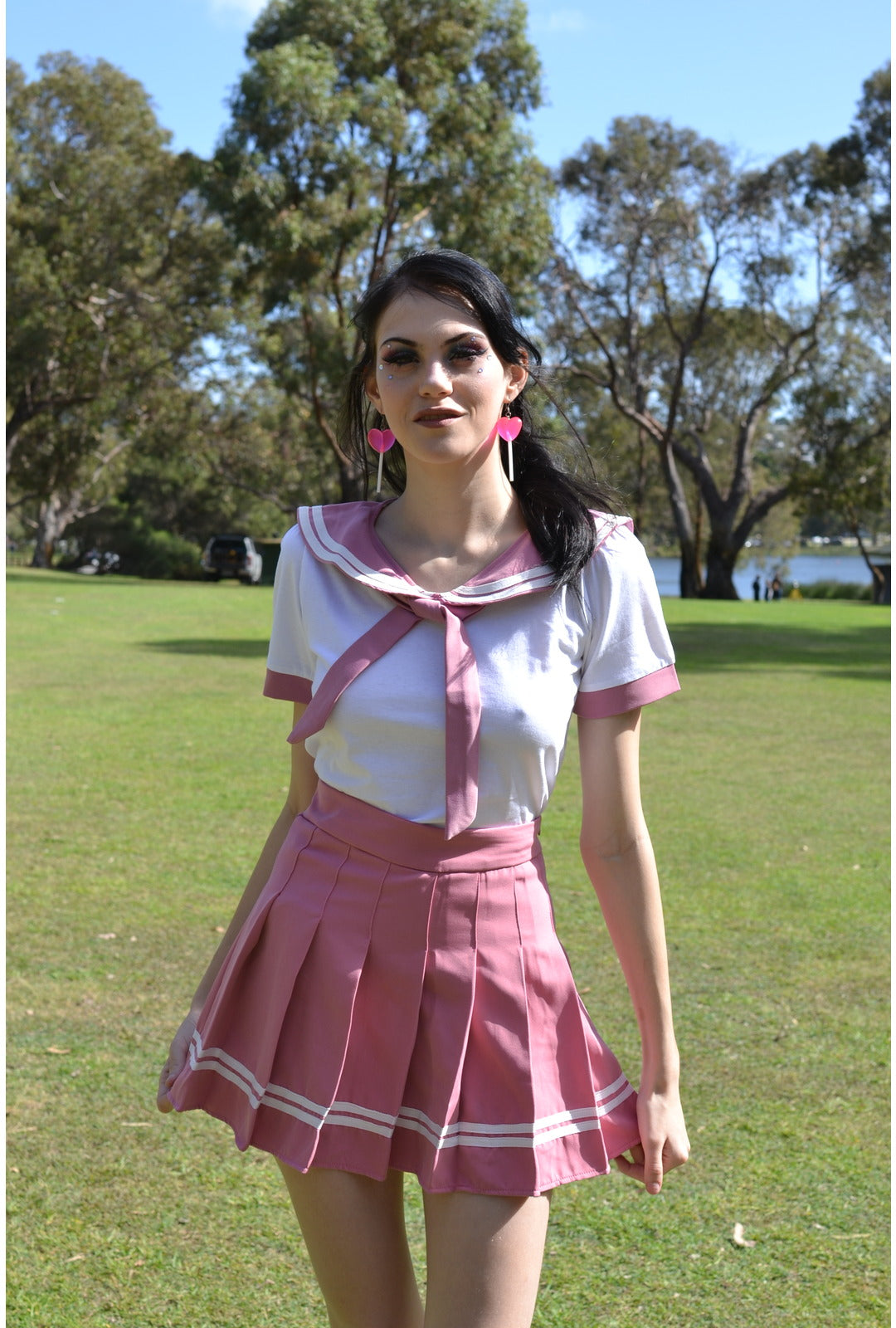 Super cute white short sleeved top with pink sailor bib, neck tie and sleeve trim. Perfect to wear with an adorable pleated skirt or tuck it into some jeans for everyday wear!