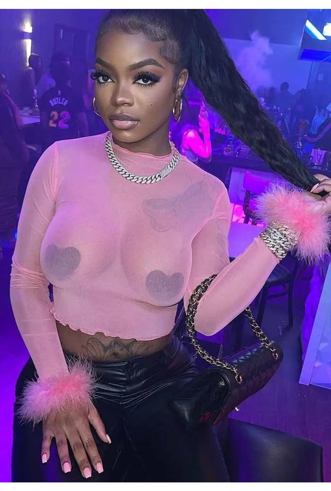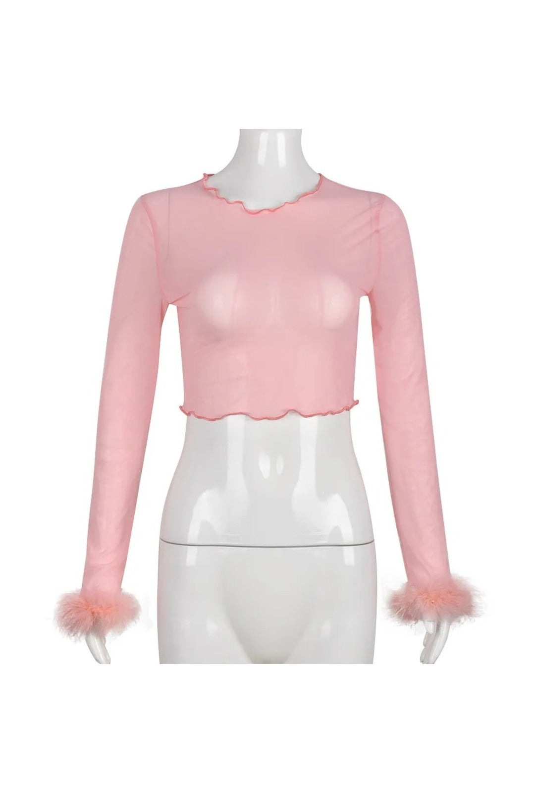 This super adorable long sleeve pink mesh top has fluffy pink feather wrist trim. It has absolute 90s vibes and is also great to wear to parties and your night out!