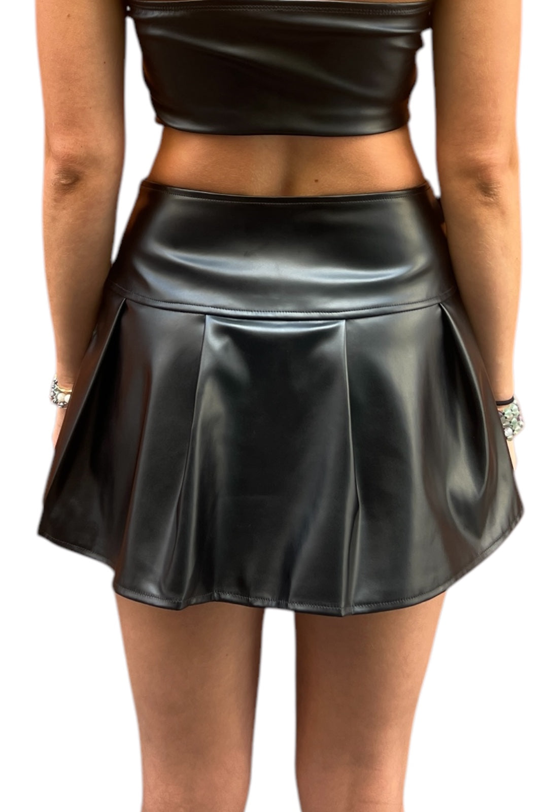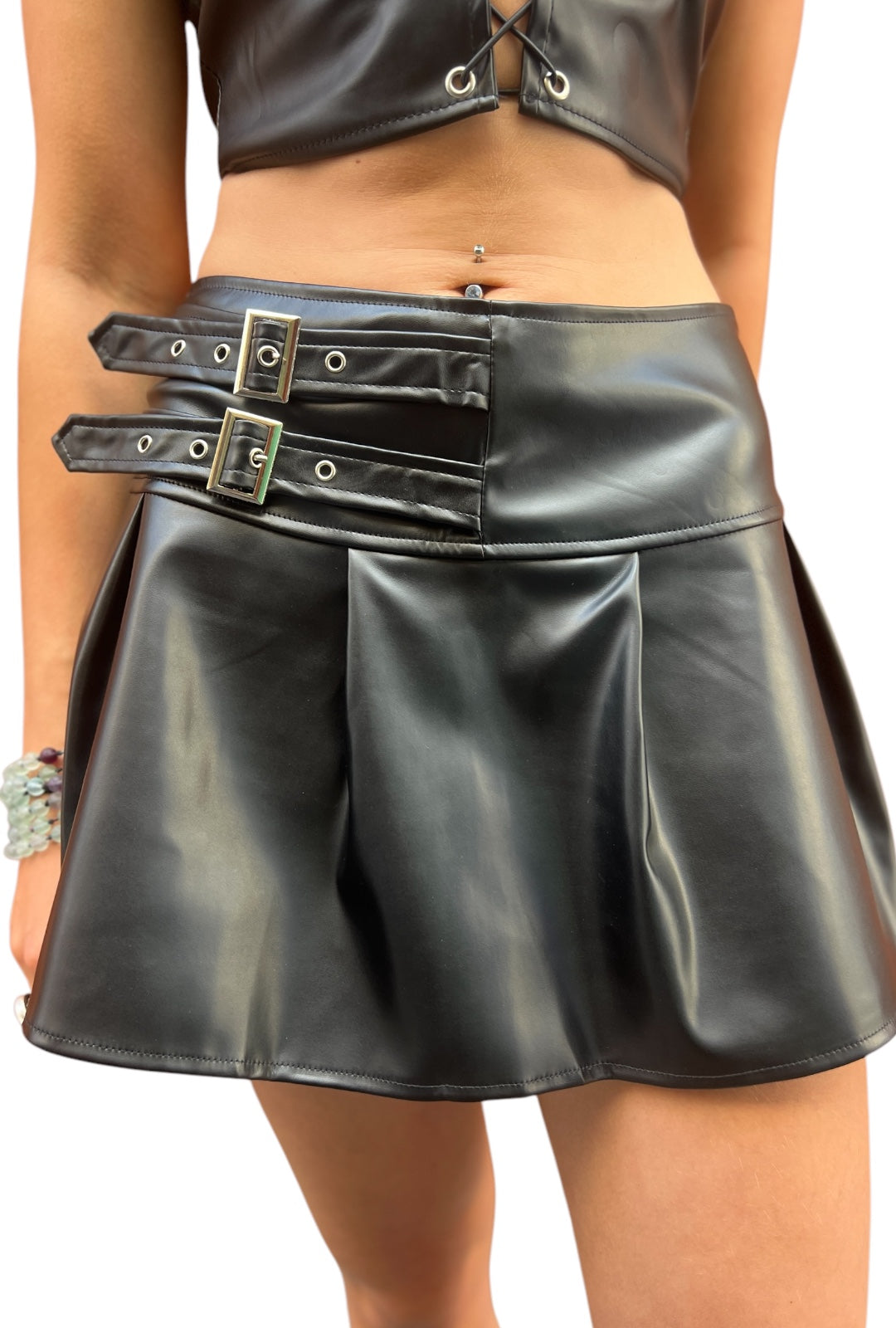 A little bit punk, a little bit naughty, and a whole lot of stylish, this black pleather mini skirt features a double buckle along the waistline and pleats on the front and back.