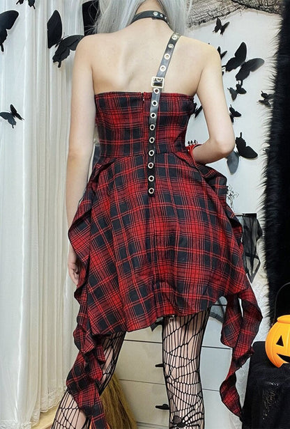 This Punk Red Plaid Strappy Dress will get you ready to rock out in style! Featuring a strapless style and black eyelet harness with silver o-ring, you'll be turning heads with the flirty red plaid material, enhanced by a tiered gathered skirt with long gathered tails. Get ready to punk up the party!
