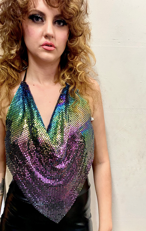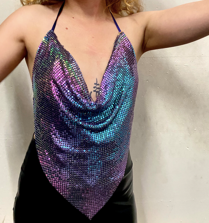 Our Rainbow Metal Mesh Crop Top is the perfect party top! This top is made out of a metallic rainbow metal material with a cowl neckline, pointed triangle bottom and a satin lining. Comes with adjustable ties and fits O/S (S - L).