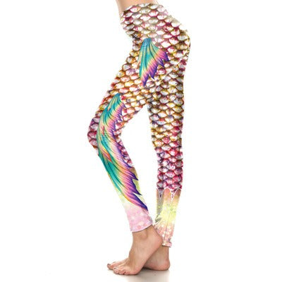 Venture into new sartorial seas with these fab-fin-tastic leggings! Show off your scaly style with their o-fish-ally awesome pink and yellow gradient scale print with rainbow side fish fins. Slip into these one-size-fits-mosts and show off your statement leggings!