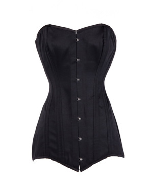 Plain black satin steel boned overbust corset with, 8 clip busk closure and classic lace up back for the perfect fit.