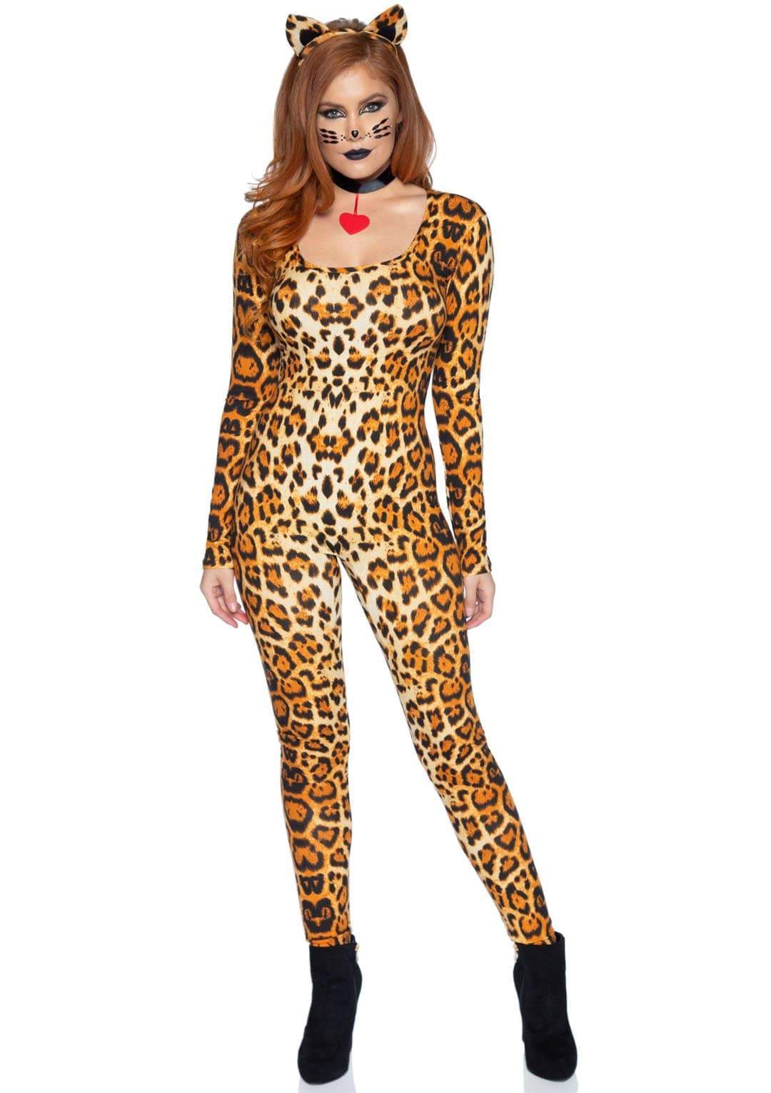 3 PC Cougar, includes brushed spandex leopard print catsuit with keyhole back and tail, ear headband, and spiked collar with heart charm.