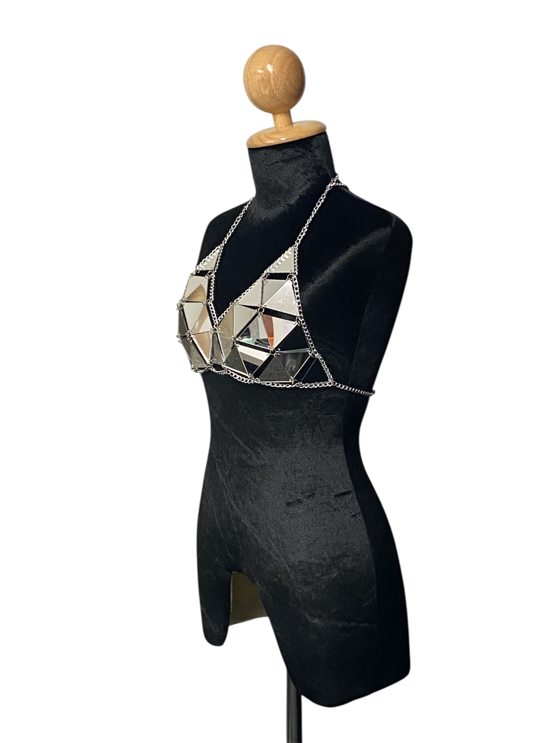 Turn heads at your next festival with this silver geometric bikini top. The reflective triangle design catches the light beautifully, while the adjustable chain closure lets you dial in the perfect fit. Whether you're dancing under the stars or soaking up the sun, this top delivers serious style credentials with an attitude to match.