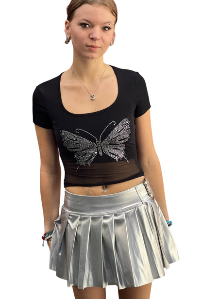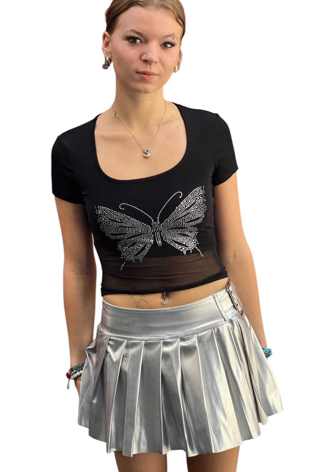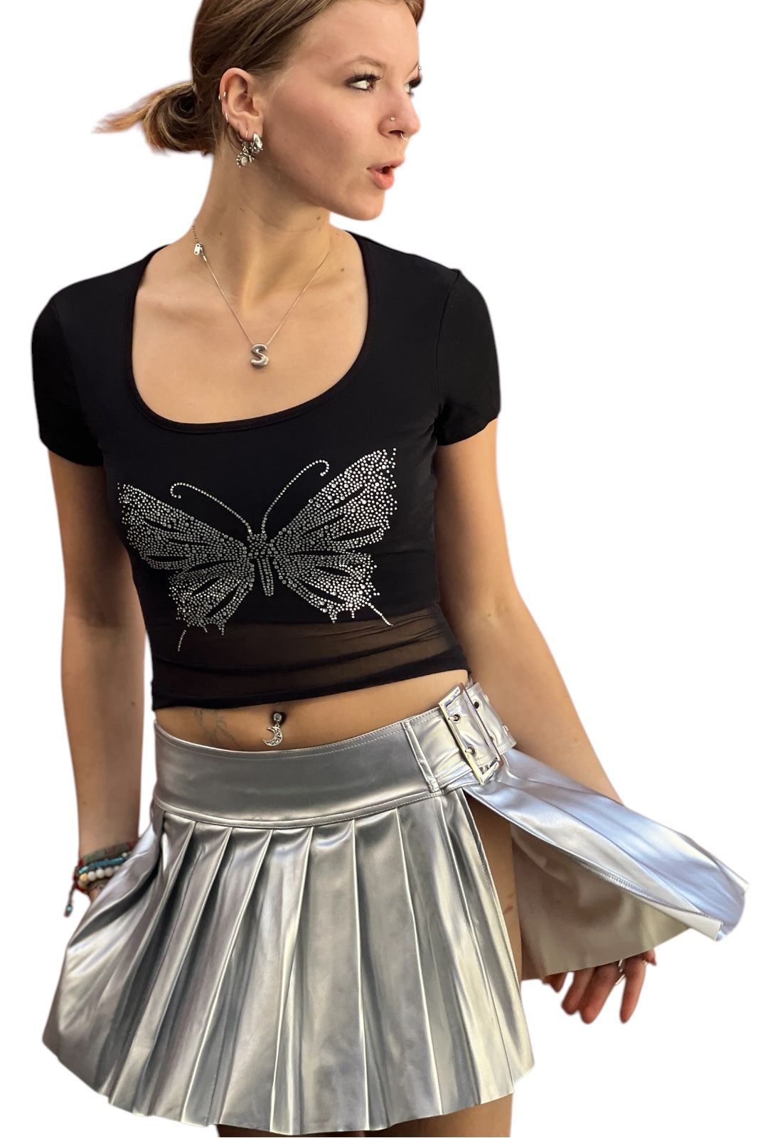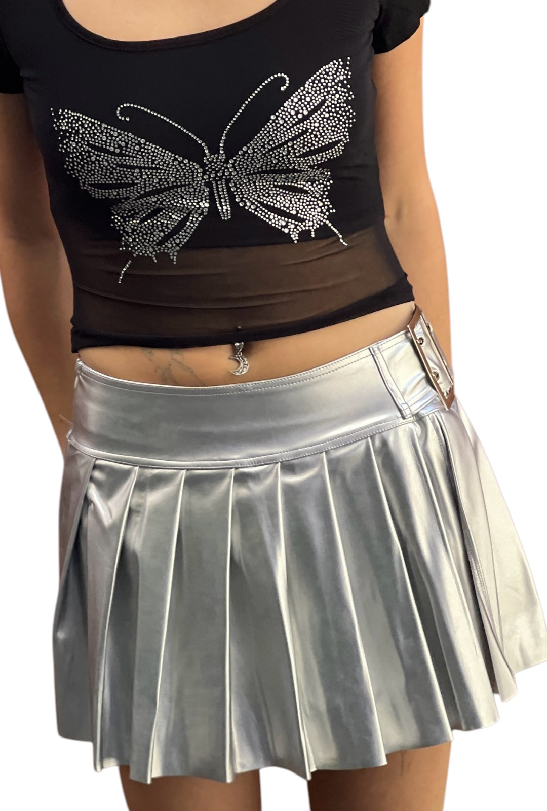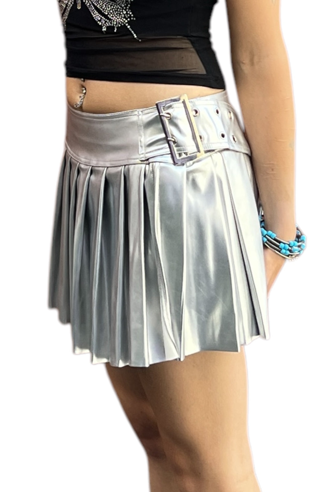 Shine like a star in our Silver Metallic PU Leather Pleated Mini Skirt. Its metallic silver finish and large buckle add a touch of edgy glamour to your festival or clubbing look. The a-line pleated design flatters all body types.