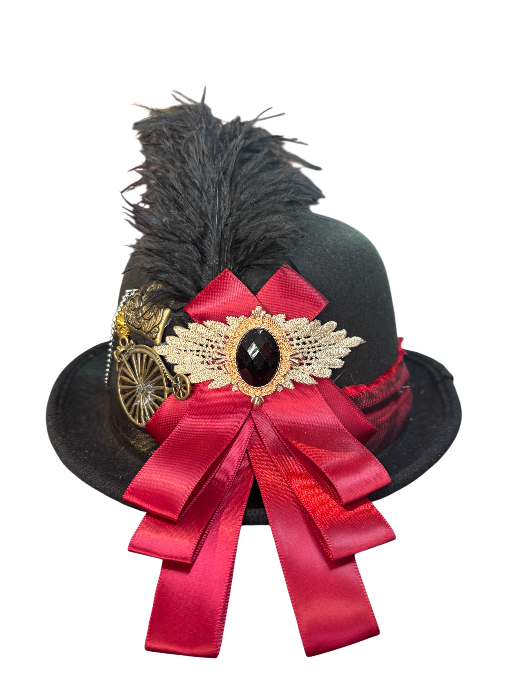 Elevate your style with this steampunk bowler hat featuring a striking red ribbon and a dazzling gem accent. Crafted to blend classic charm with edgy flair, this hat adds a unique, eye-catching touch to any outfit. Perfect for cosplay, themed events, or making a bold fashion statement, it invites you to stand out with confidence and originality.