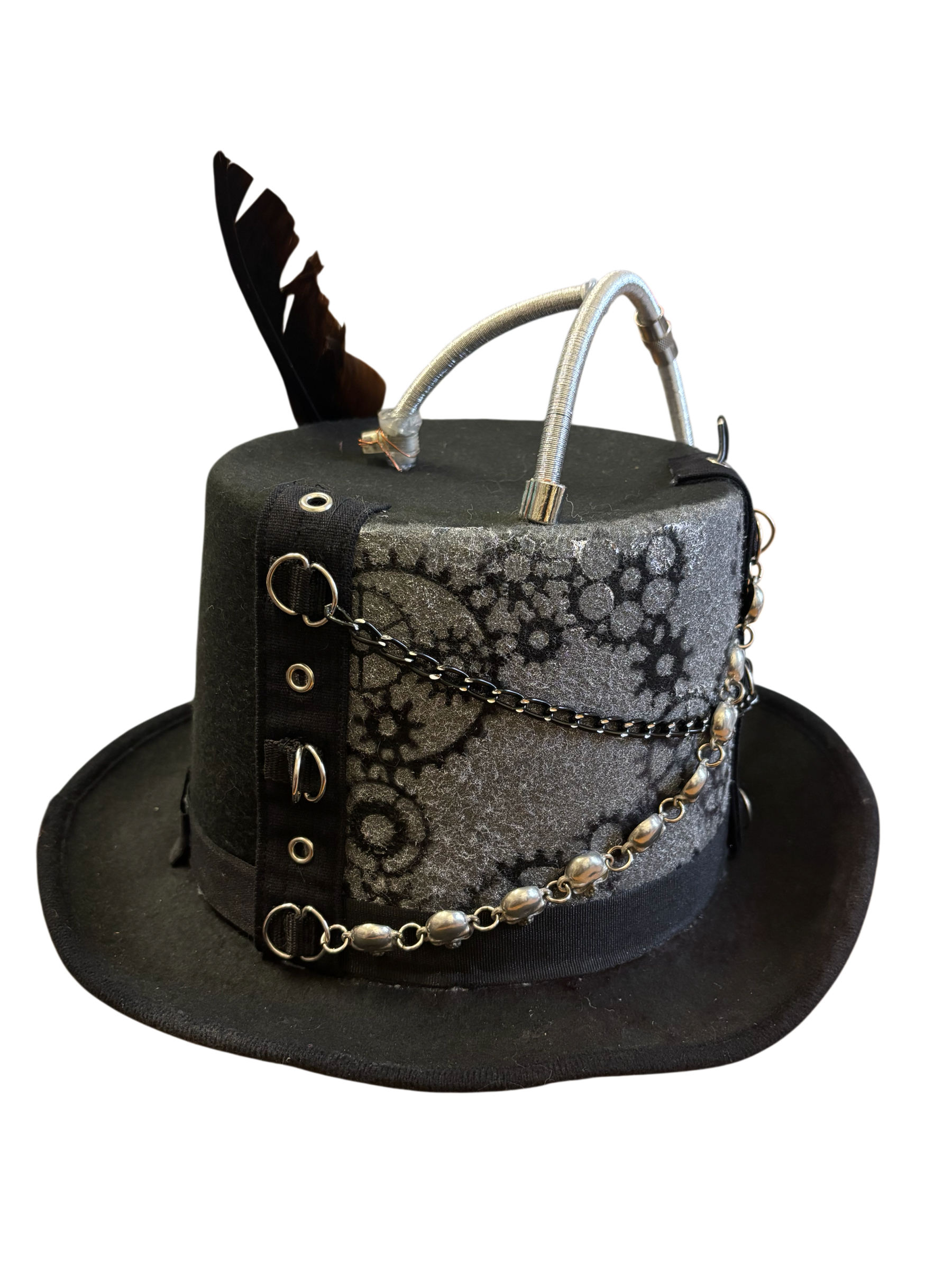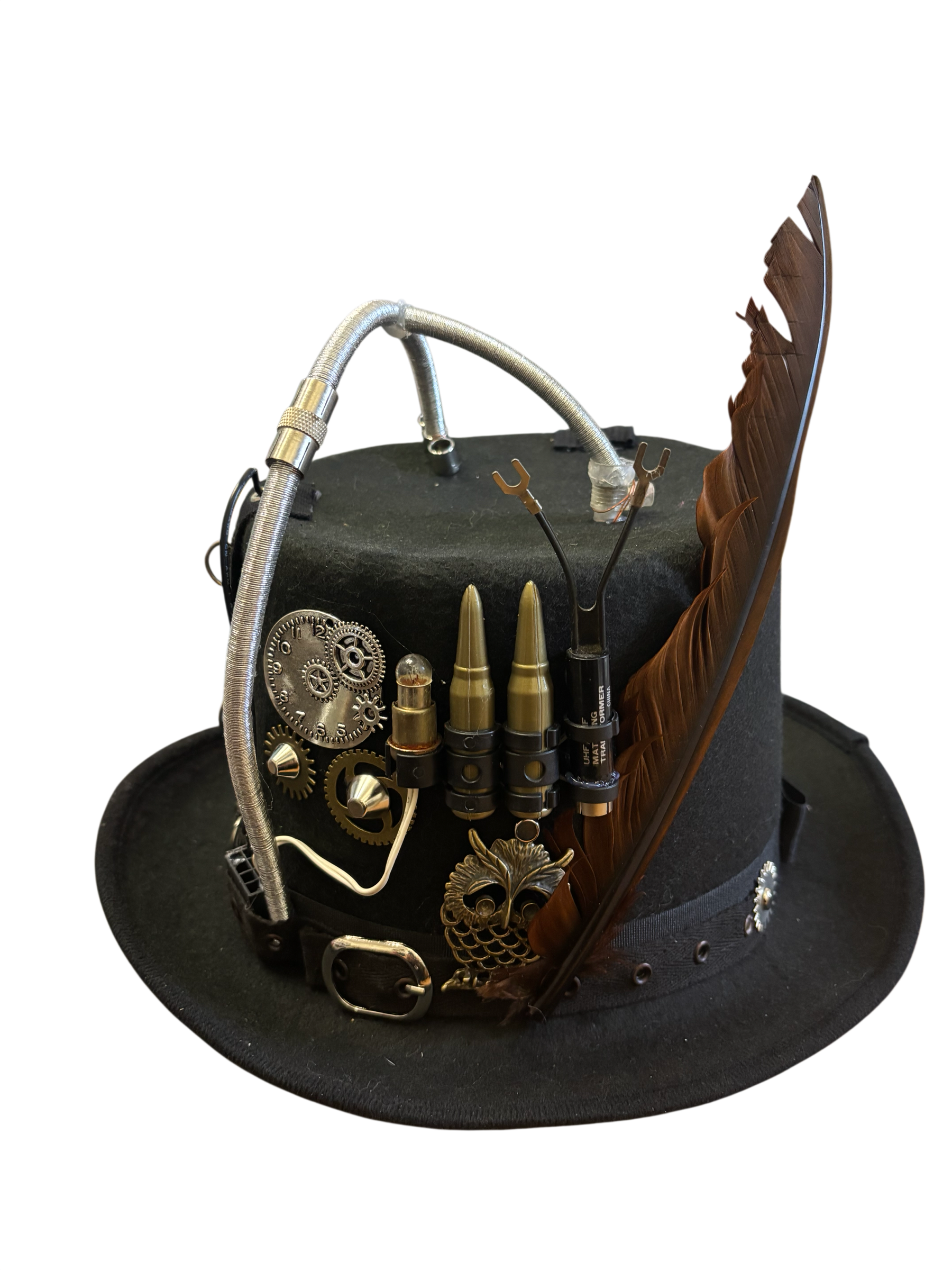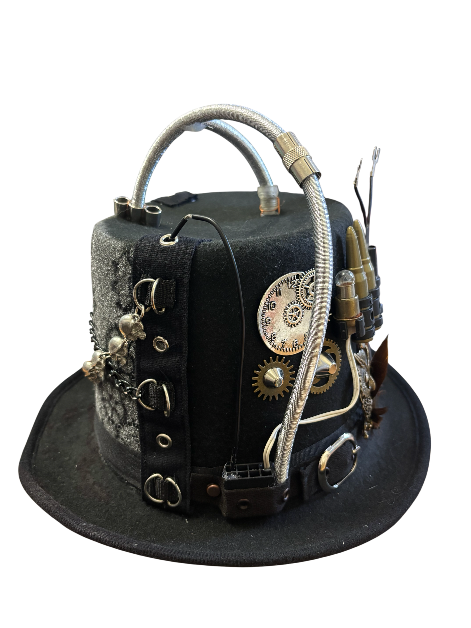 Step into a world of Victorian innovation with this striking Steampunk Hard Wired Top Hat. Adorned with cogs, intricate wiring, and mechanical embellishments, this statement piece transforms any outfit into an industrial masterpiece. Perfect for themed events, cosplay, or those who dare to embrace retro-futuristic style, it combines authentic steampunk aesthetics with eye-catching detail. Whether you're channeling a mad inventor or a time-traveling adventurer, this hat demands attention and sparks conversation. Eclusive to Hurly Burly