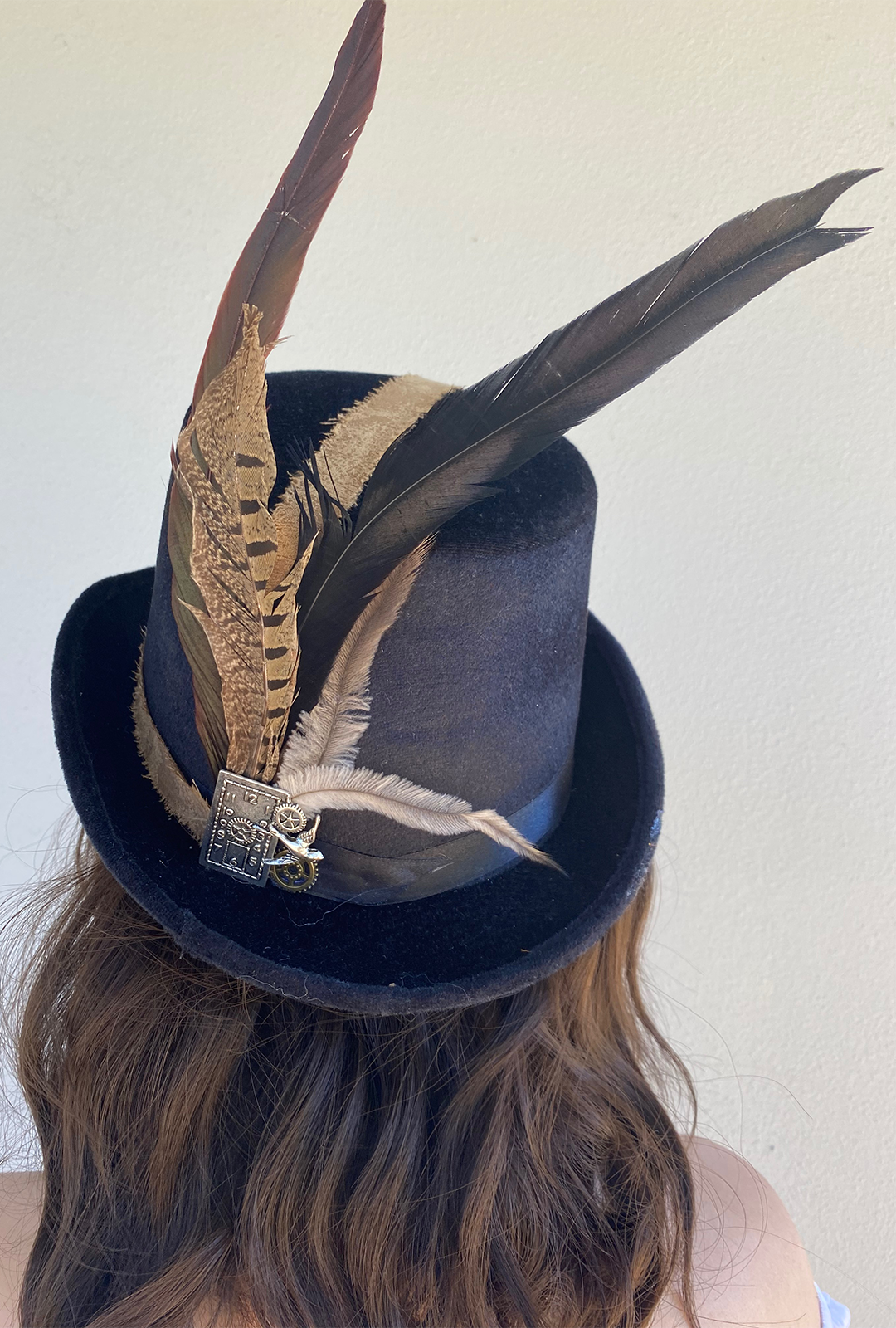 Steampunk Long Brown Feather Hat includes Brown, Printed and Extra Long Black Feathers with a Silver Square Steampunk Pendant sitting infront of the feathers on the band.