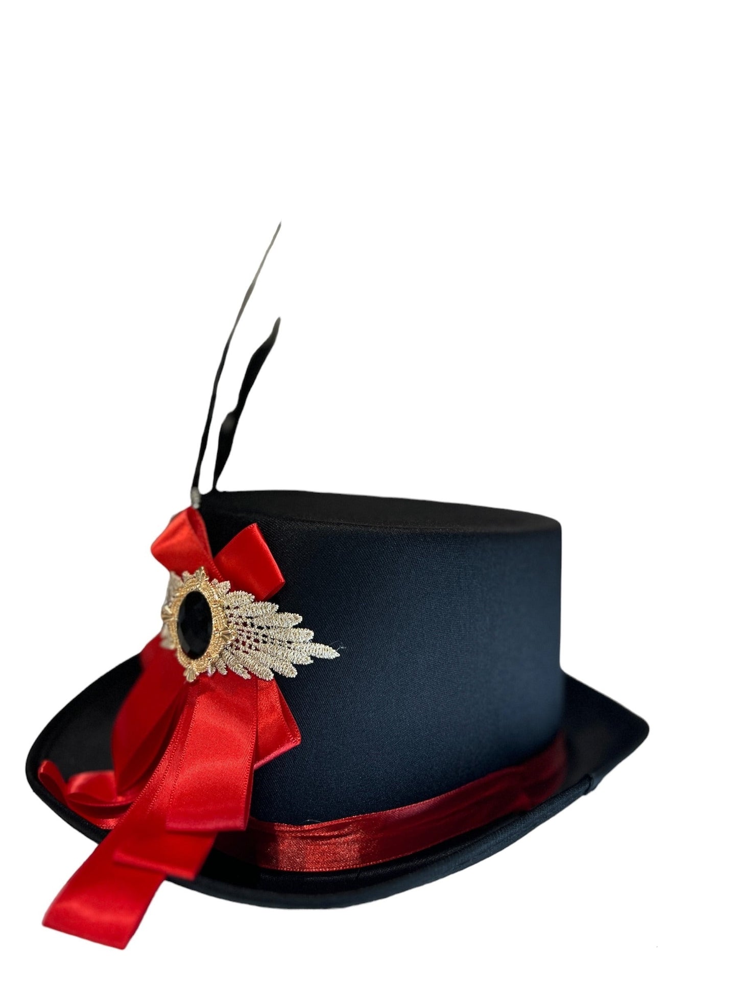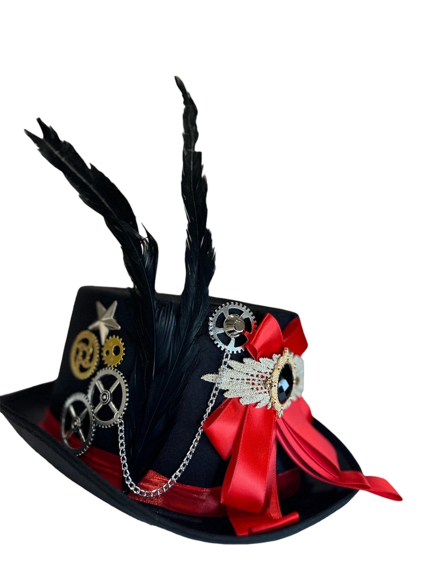 Put the “steam” in your style with this chic Steampunk Red Bow and Chains Hat! Featuring a bold red large bow with a golden applique and black gem pendant, plus golden and silver cog pendants with a silver chain and fluffy black feathers – this hat is sure to spark conversation! Ready, set, go!