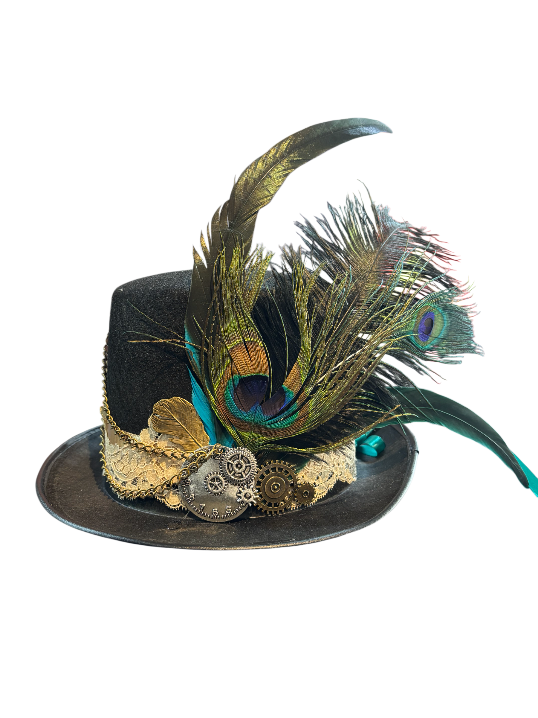 Step into the world of Steampunk with our stunning black top hat. Made with intricate cream lace and adorned with a striking peacock feather, this hat is sure to make a statement. Perfect for special occasions or everyday wear, this top hat adds a touch of vintage elegance to any outfit.