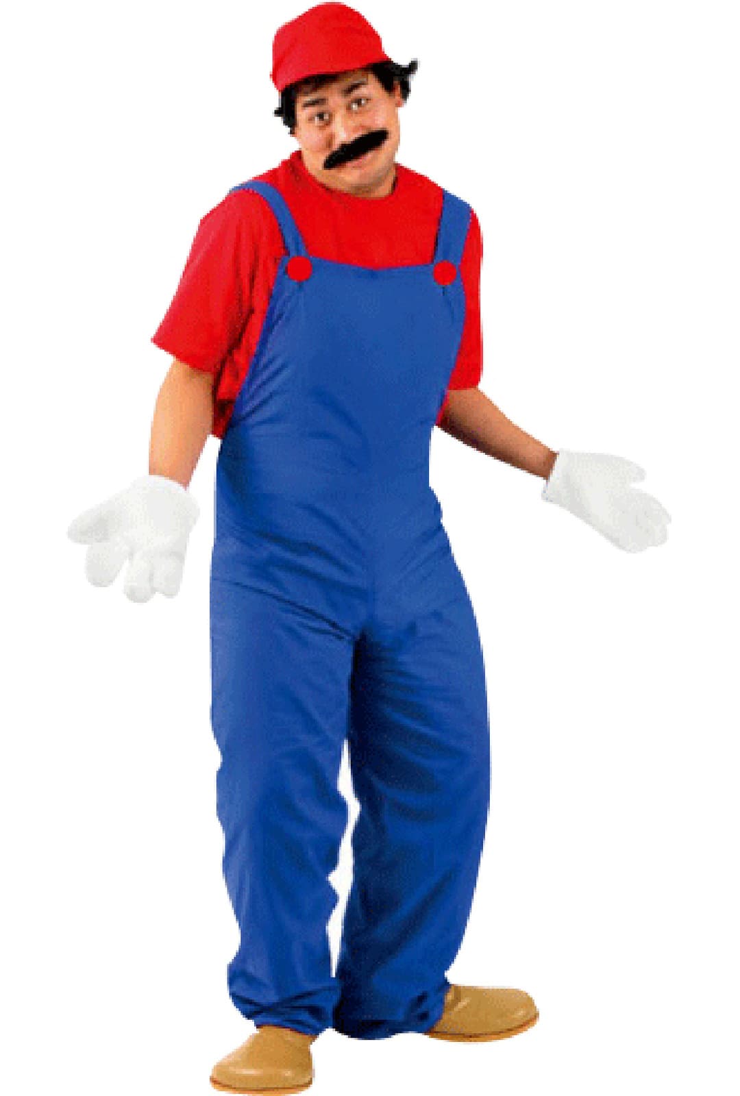 Includes blue overalls, red short sleeved t-shirt, red hat, white gloves and moustache.